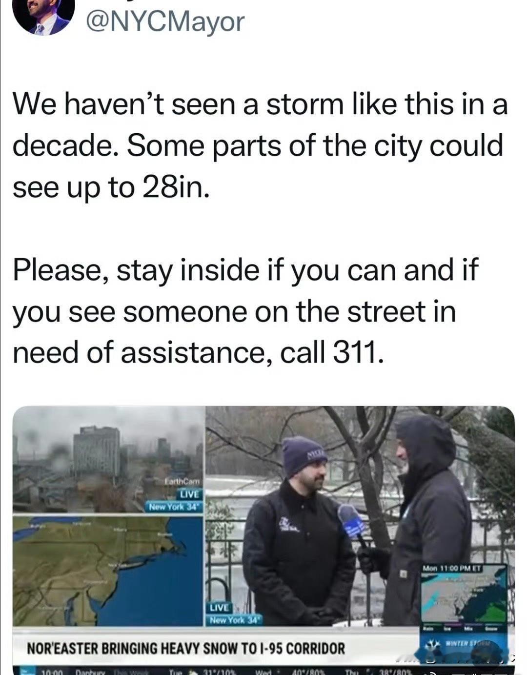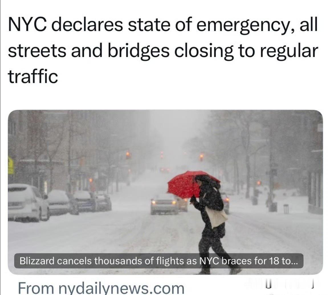纽约市周一有超大暴风雪,十年来最严重,某些地区降雪量可高达0.7米 据预报,纽约市明天(2月23日,星期一)正面临一场强大的暴风雪袭击。官方已发布暴风雪警告,市长也宣布了紧急状态和旅行禁令。 预计全市平均13-18英寸(约33-46厘米),局部地区可能达到24英寸(约61厘米)。降雪最猛时段在今晚到明天早上,强度可达每小时1-2英寸。 持续风速25-35 mph,沿海阵风高达50-60 mph,加上大雪可能导致白化天和停电。 官方发布行政令 旅行禁令:今晚9点至周一中午12点生效,除应急车辆外禁止上路。 学校关闭:周一所有公立学校停课,是真正的"老式雪假日"。 交通停运:史坦顿岛渡轮下午5点停运,部分公交和轻轨晚6点起停运。 百老汇:今晚的晚场演出已取消。 已进入紧急状态,周一学校停课、路桥交通暂停、市长呼吁居民尽量不出行 。 根据现有日程,2月23日当天参议院和众议院原定是开会的。 天气原因,国会取消周一的投票。 目前暂定周二恢复。 周二晚,是总统国情咨文,如果DC天气差,可能会有议员会选择缺席 。