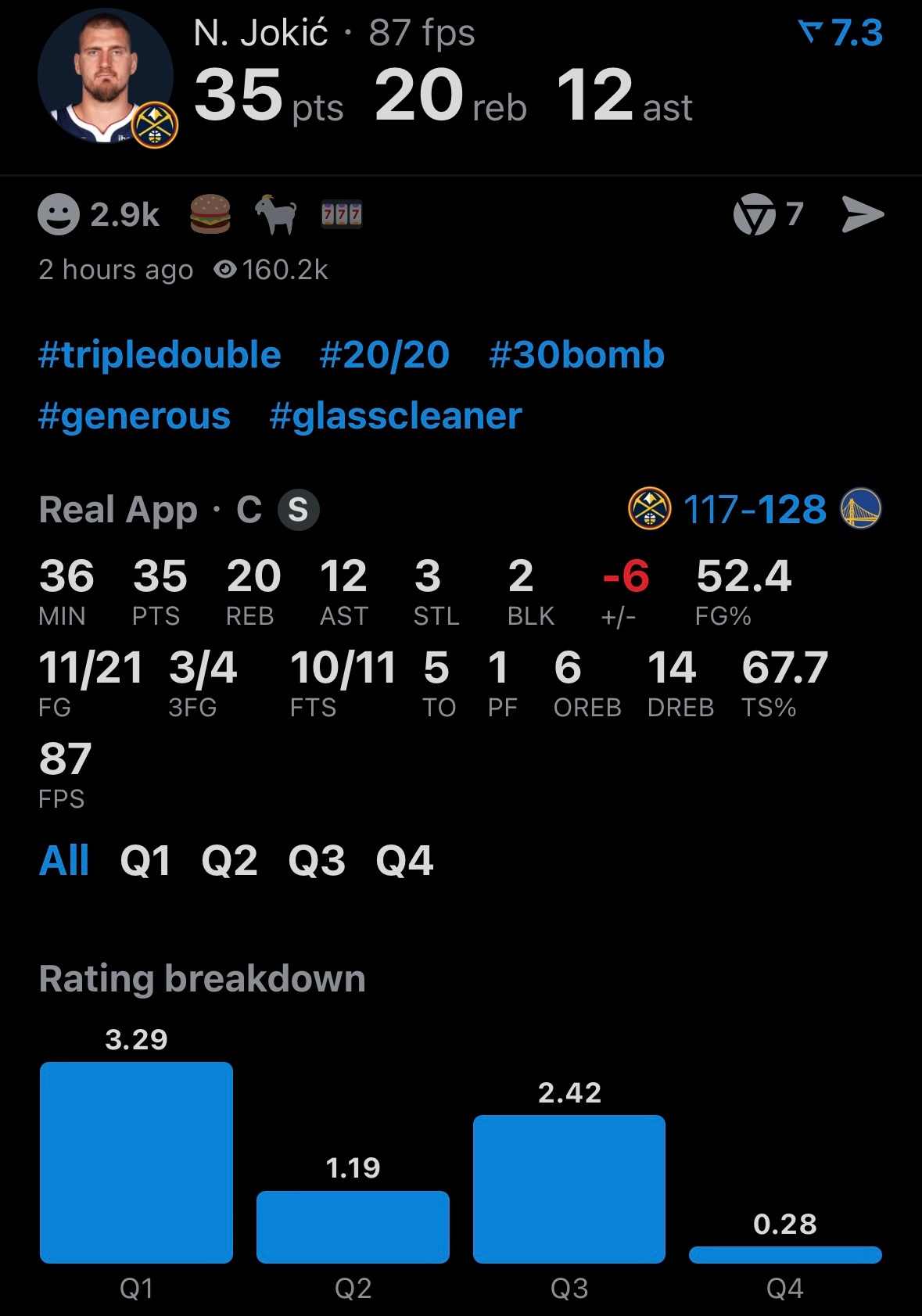 体系运转,残阵勇士击败掘金。波杰准三双,勇士7人得分上双。波杰18分15板9助攻,约基奇空砍35分20板12助攻。掘金vs勇士