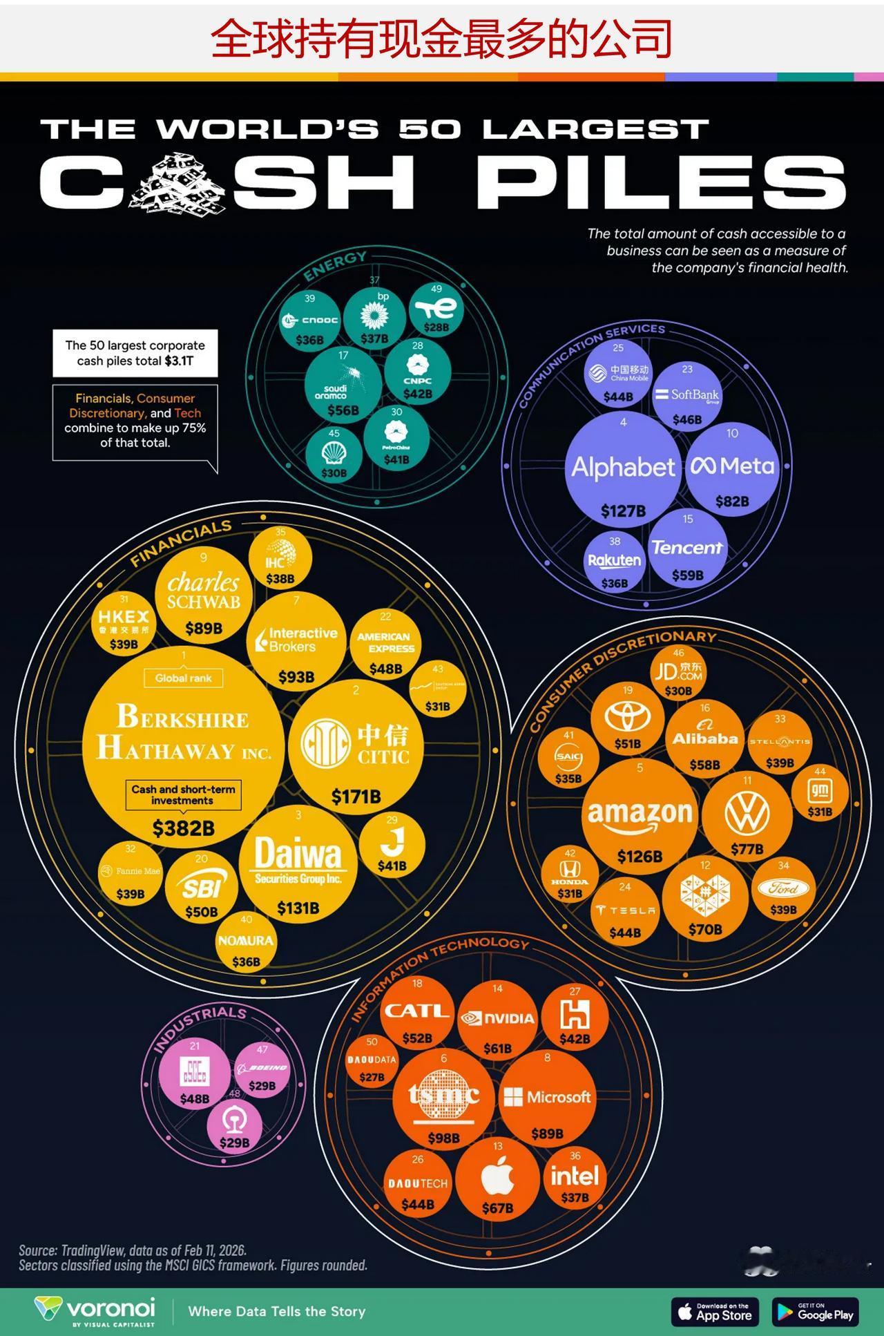 一图看全全球持有现金最多的公司 企业所拥有的现金对于支付员工薪酬、维持运营以及衡量财务状况都非常重要。 下面这张图表展示了现金持有量最大的 50 家公司,其数据来自 TradingView,旨在突出哪些公司拥有最多的现金储备。 该指标反映了公司流动性最强的资产:现金加上诸如短期国库券之类的短期证券,这些证券通常会在一年内到期。 ——哪些公司拥有最多的现金? 伯克希尔·哈撒韦公司以高达 3820 亿美元的资产规模位居榜首。 紧随其后的是中国中信集团以及日本最大的金融经纪公司之一大和证券集团。 大型科技公司也位列前五,其中Alphabet公司拥有 1270 亿美元的资产,亚马逊公司(Amazon)拥有 1260 亿美元的资产。 ——为什么巴菲特持有如此多的现金? 在前 50 大公司中,金融行业总体拥有最多的现金储备,达 1.2 万亿美元——这在一定程度上是由于严格的资本规定要求银行必须保持大量的流动资金缓冲所致。 伯克希尔·哈撒韦公司则有所不同:其持有的现金储备具有战略意义,而非出于监管要求。 在连续 12 个季度持续卖出股票之后,巴菲特及其团队将公司大量的流动资金投资于短期美国国债,这表明股票估值看起来已经过高。 这家公司的现金及现金等价物占总资产的比例达到了历史最高水平——约占总资产的 31%。 从历史上看,这种情况往往与它等待重大经济或市场动荡发生的时间段相吻合。在此期间,它会先静观市场价格回归均值,然后才开始投入资金——在此期间,它会悄悄地积累资金储备。 ——为何大型科技公司拥有如此巨额资金 美国科技七巨头:Alphabet、亚马逊、Meta、微软、苹果、英伟达和特斯拉这七家公司总共拥有 5970 亿美元——这笔资金足以收购大多数标准普尔 500 指数成分股公司。 传统上,大型科技公司就是巨大的“现金工厂”:高额的毛利率和可扩展的成本结构意味着新增收入能够迅速转化为现金。 尽管它们投入大量资金建立了人工智能工厂,但它们在这些工厂的建设上并未动用多少现金储备——而是选择了举债的方式。 它们持有大量现金储备,一方面用于资助收购活动,另一方面也为了防范可能出现的经济动荡,比如来自关税或地缘政治冲突的威胁。