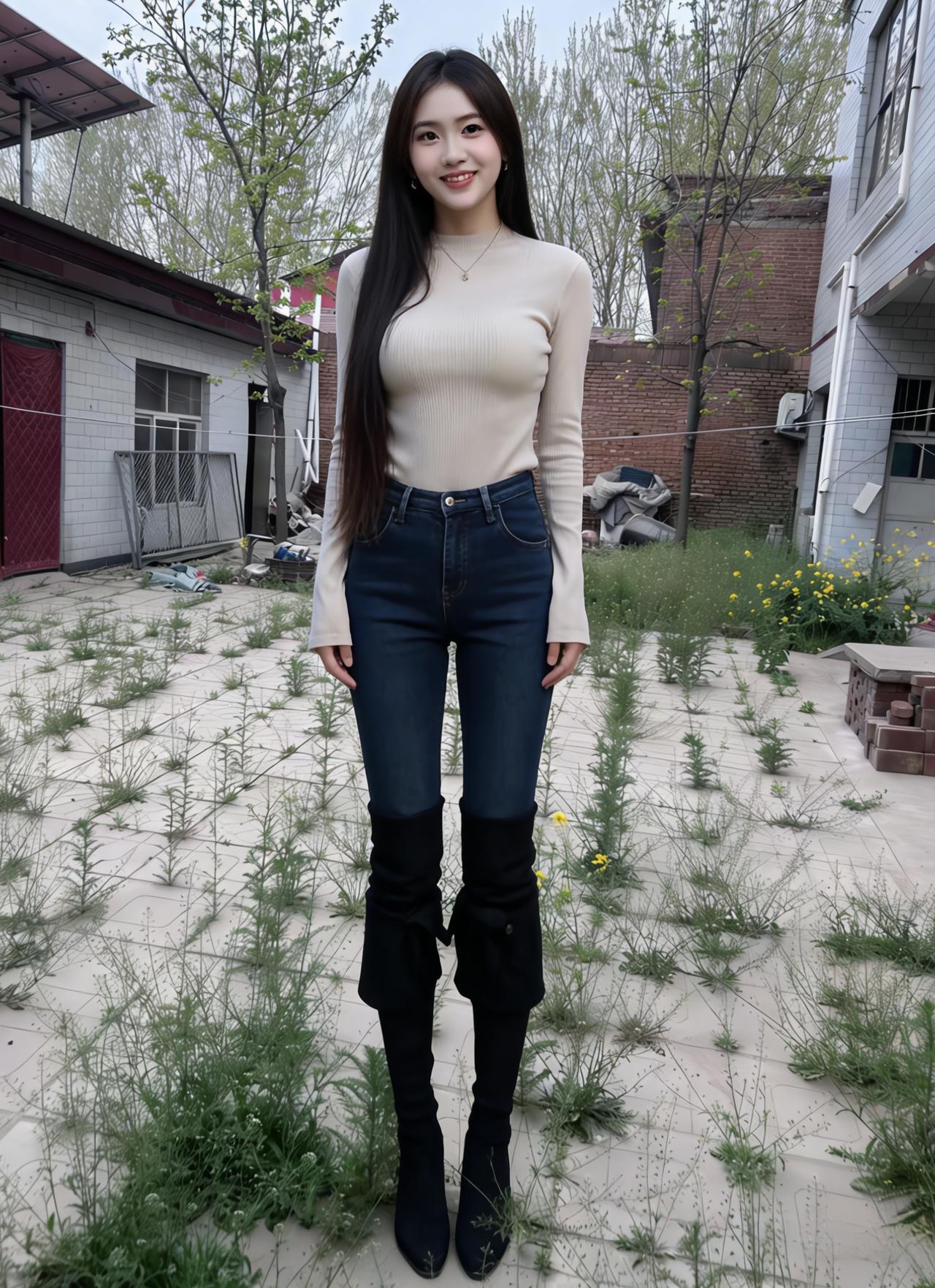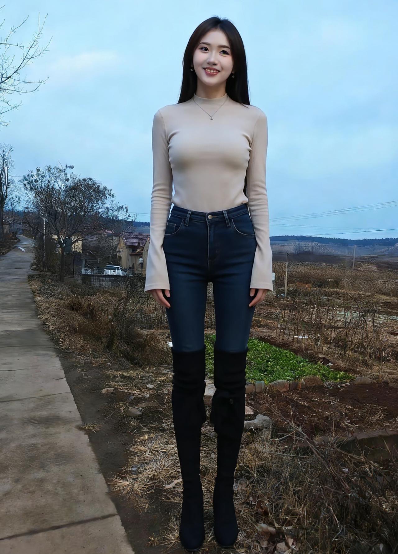 你是融在烟火里的一抹柔光 不似繁花灼灼,却有清浅绵长 素衣裹身,是简约的诗行 长靴落地,是坚定的向往 ~ 从室内的温软,到户外的苍茫 从红砖青瓦,到枯木疏林 你始终亭亭而立,自带清光 长发如瀑,垂落肩头,拂过衣裳 细链轻绕颈间,添了几分温婉的妆 修身的衣料,衬出挺拔的脊梁 没有繁复的点缀,只有干净的模样 牛仔的硬朗,中和了针织的柔肠 黑靴的沉稳,托起了身姿的昂扬 ~ 你笑时,天地都跟着敞亮 眉眼弯弯,盛着星光与暖阳 静立时,如松如竹,自有风骨清扬 不问身处何方,不问周遭景象 一身简装,一身坦荡 站在乡野的风里,站在家院的光中 把平凡的日子,活成温柔的向往 这世间最美的模样 从不是盛装堆砌的虚妄 是你这般,素面净颜,身姿清朗 自带温柔,自带光芒 在烟火人间,静静绽放,岁岁芬芳