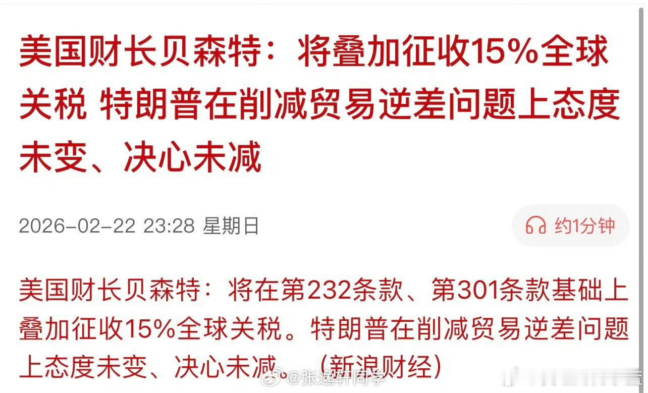 美国财长贝森特:将在第232条款、第301条款基础上叠加征收15%全球关税。特朗普在削减贸易逆差问题上态度未变、决心未减。