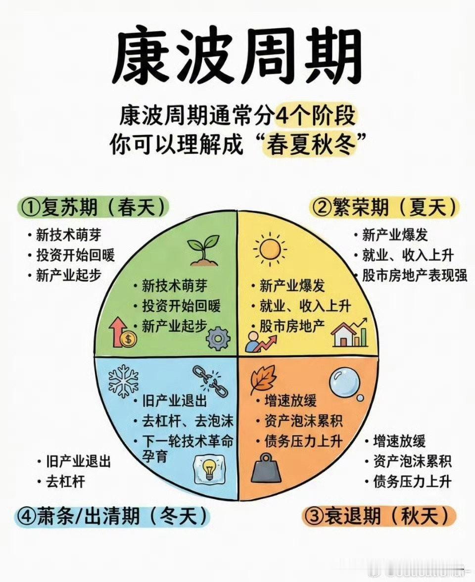 史上最长的春节假期余额不足,明天就得打螺丝。 经济周期的春天尚远,但大自然的春天已在眼前。 不管处在哪个阶段,我们都要学会好好享受生活。 康波周期的四个阶段,相当于春夏秋冬。 现在处在哪个季节,大家理解各自不同。 个人觉得现在顶多深秋,还没步入冬天。 一个季节大约时长15年,你们自己算吧