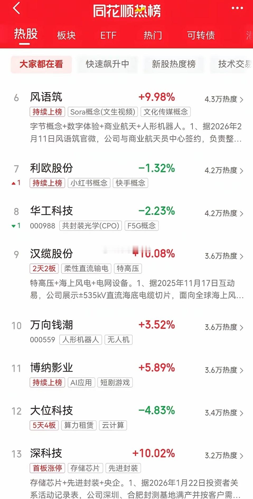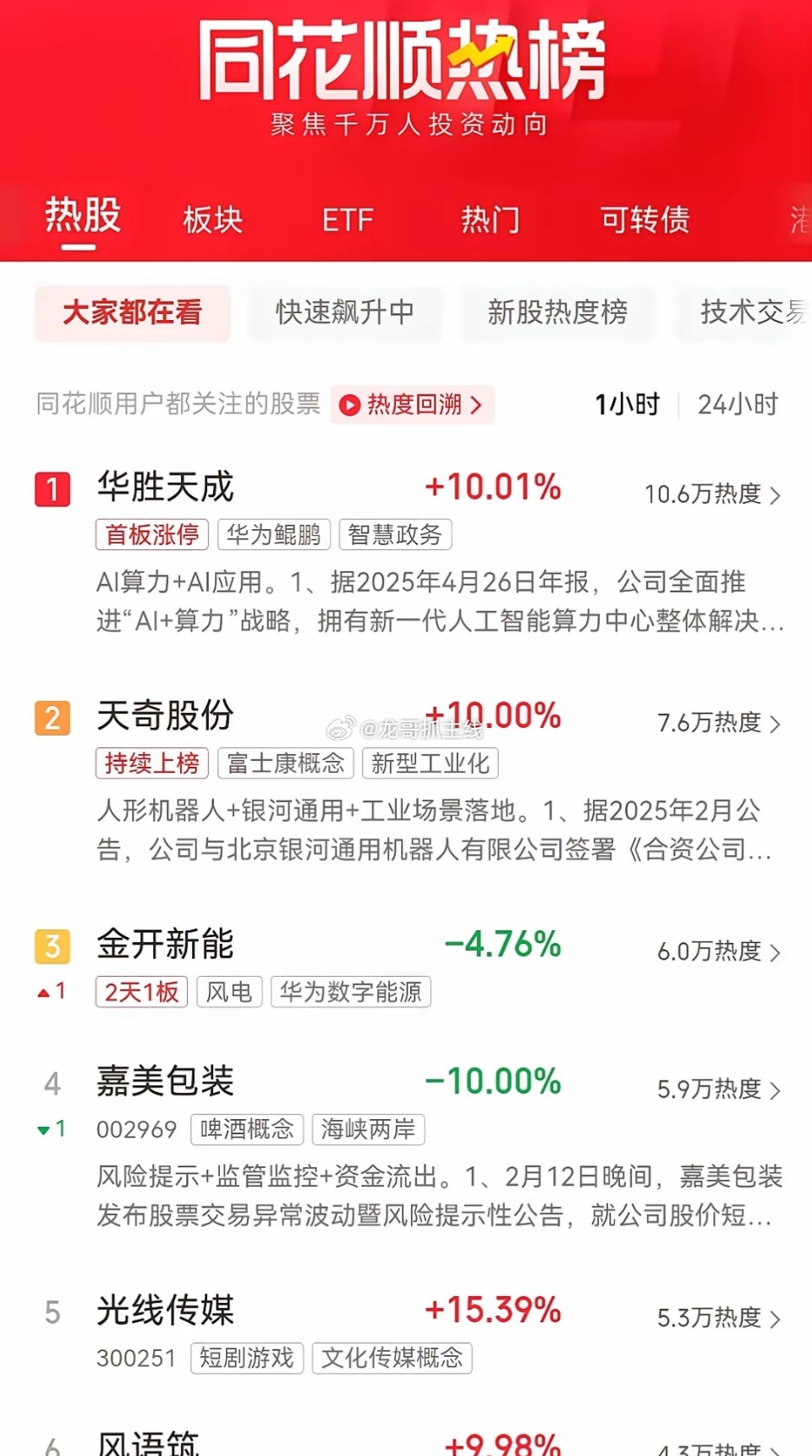 距离A股开盘不足24小时,春节期间各种题材发酵,目前同花顺热股榜前十名公司名称和题材分别是:1. 华胜天成:首板涨停、华为鲲鹏、智慧政务2. 天奇股份:持续上榜、富士康概念、新型工业化3. 金开新能:2天1板、风电、华为数字能源4. 嘉美包装:啤酒概念、海峡两岸5. 光线传媒:短剧游戏、文化传媒概念6. 风语筑:持续上榜、Sora概念(文生视频)、文化传媒概念7. 利欧股份:持续上榜、小红书概念、快手概念8. 华工科技:共封装光学(CPO)、F5G概念9. 汉缆股份:2天2板、柔性直流输电、特高压10. 万向钱潮:人形机器人、无人机从以上热股榜前十名来看,基本上还是以科技为主,包括机器人、人工智能、华为等,资金憋了好几天了,明天是马年首个交易日,市场应该是很有看点的,拭目以待吧。股票交流股票财经股市分析