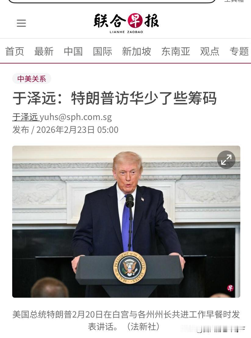 新加坡联合早报今天(2月23日)发表评论员于泽元的评论:美国联邦最高法院对特朗普的裁决,重挫了特朗普打造的强势总统形象,也让特朗普在访问中国的时候,少了讨价还价的筹码。 于泽远认为不管法院的裁决怎么样,特朗普绝对不会屈服,必定会找到其他法律依据来支持关税政策的实施,但这份裁决标志着美国反对特朗普的声音越来越大,会不利于特朗普的中期选举,一旦民主党赢得胜利,特朗普必将成为一个跛脚总统等待他的将是持续不断地弹劾 于泽远认为这份裁决对于中国来说是好事,大豆采购、波音飞机和能源出口,都将成为中国人手中的筹码来同特朗普谈判。甚至在台湾问题上也有可能做出让步。 所以,他断定如果特朗普访华,中国肯定会给予高规格接待,给足特朗普面子,让特朗普获得短期实惠,以迫使特朗普在台湾问题上做出符合中国要求的表述。有助于改善中国局促的国际环境。但是不影响中美长期博弈的历史格局 对于于泽远的评论,我们是怎么看的?筹码不筹码的永远是掌握在自己手中。如果中国没有强劲的实力,也不会被美国如此重视。中国虽然被特朗普的关税所制裁,但是2025年出口数据高达1万亿美元足以证明了中国制造的口碑。 联合早报的评论刻意的矮化中方,称美国法院的判决将中方置于有利的位置,他要弄清楚的这份判决是美国老百姓对特朗普政府加征关税,提高他们生活成本的不满,中国自从关税开证以来就多次强调,这是一把双刃剑伤人又伤己。