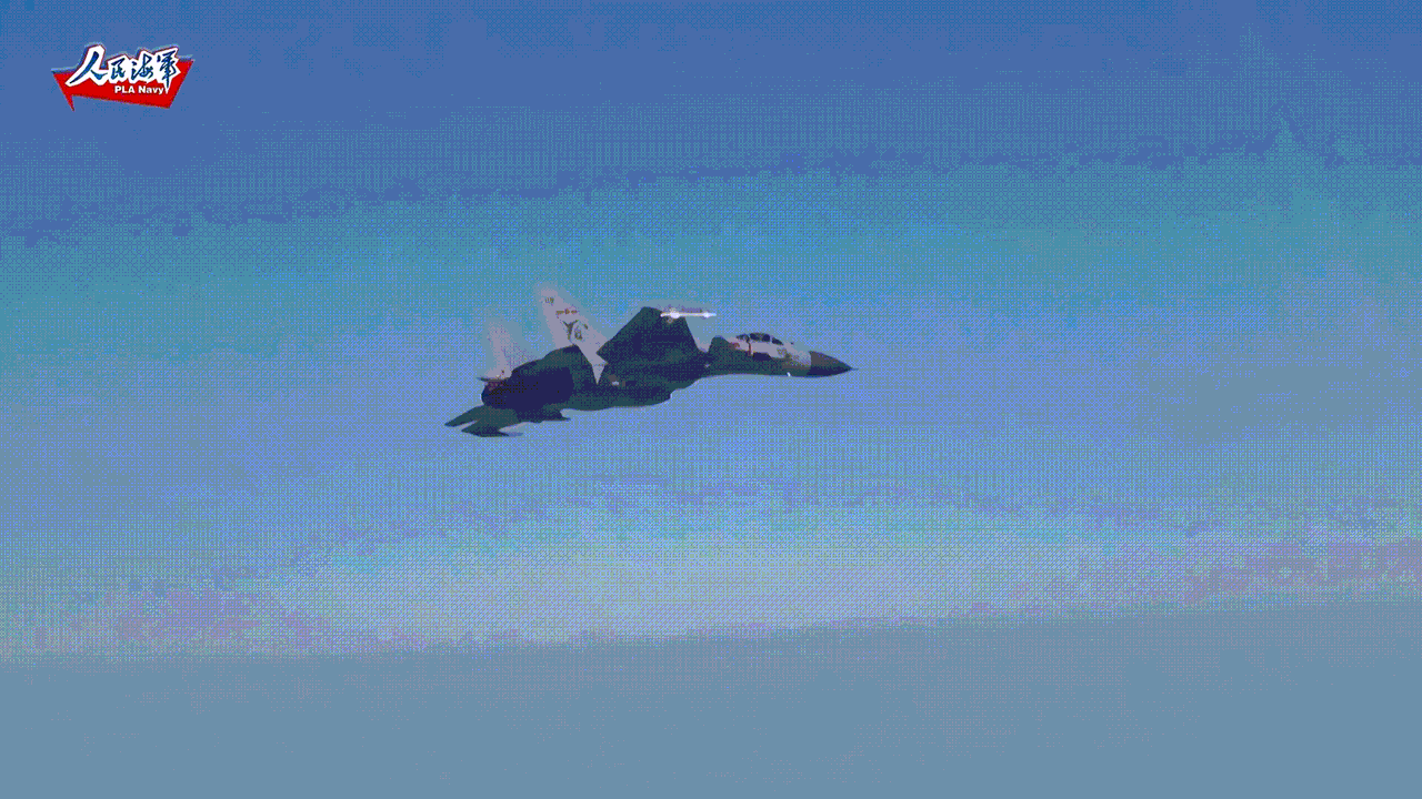 海军的舰载机歼十五基本型,在演训中实弹发射霹雳八号空空导弹。从这个动图能看出,这是一个基础科目训练,不是在狗斗互咬大机动过程中发射,基本上是平飞状态发射的,估计靶机也没有处于机动飞行状态,导弹射出后没有看到强烈的转弯。