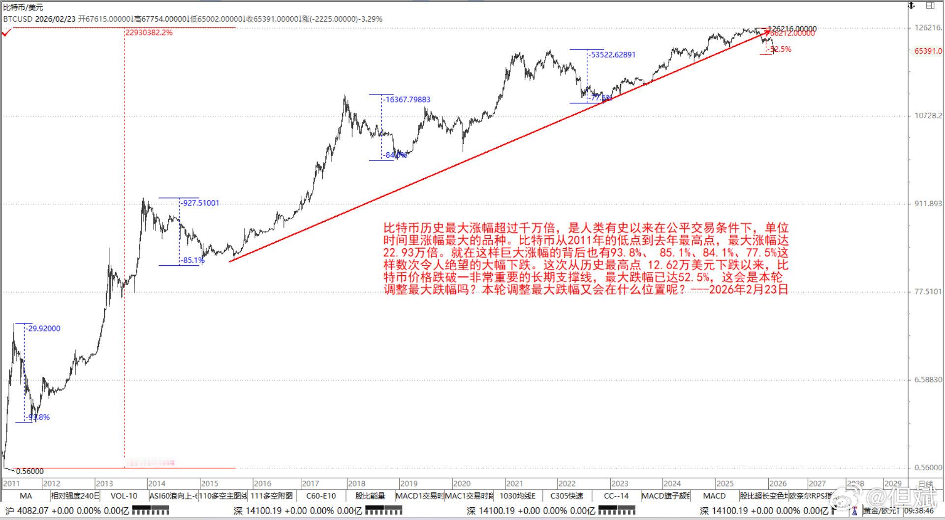 转马仁辉 观点:“比特币历史最大涨幅超过千万倍,是人类有史以来在公平交易条件下,单位时间里涨幅最大的品种。比特币从2011年的低点到去年最高点,最大涨幅达22.93万倍。就在这样巨大涨幅的背后也有93.8%、 85.1%、84.1%、77.5%这样数次令人绝望的大幅下跌。这次从历史最高点 12.62万美元下跌以来,比特币价格跌破一非常重要的长期支撑线,最大跌幅已达52.5%,这会是本轮调整最大跌幅吗?本轮调整最大跌幅又会在什么位置呢?---2026年2月23日”