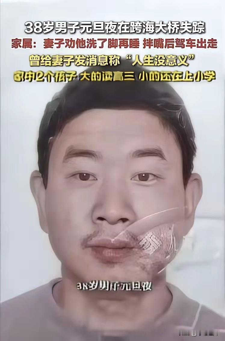 泉州38岁男子因洗脚跳桥:压垮成年人的,从来不是那盆洗脚水 福建泉州这一幕,看得人心里揪得慌。38岁男子回家想歇会儿,就因为妻子让他先洗脚再上床,俩人吵了几句,他竟直接开车冲上跨海大桥,留完遗言就没了踪影。 谁能想到,一场生死抉择,起因居然是这么件鸡毛蒜皮的小事? 根本不是洗脚的问题!38岁的男人,正是扛着全家压力的年纪,工作的疲惫、生活的琐碎,早就把心压得沉甸甸的。回家想躺一下喘口气,这点小小的诉求没被满足,瞬间成了情绪的突破口。 妻子拦着洗脚,只是寻常的生活习惯,没有半分恶意;男子赌气寻短,也不是矫情,是成年人的崩溃,从来都在一瞬间。 我们总觉得大男人该顶天立地,却忘了他也会累、也会委屈。警方紧急搜寻,妻子慌得不停打电话,哪还有半分吵架的火气?只剩撕心裂肺的后怕。 生活里哪有那么多大是大非,多的是柴米油盐的磨合。别让一时的情绪,毁了整个家;别让小小的争执,变成一辈子的遗憾。 成年人的世界,撑不住了就歇一歇,千万别拿生命赌一时之气。 你有没有过被小事逼到破防的瞬间?评论区聊聊吧!跳桥自尽