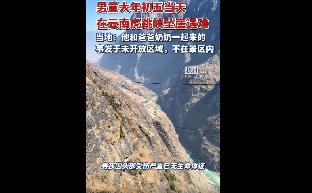 2 月 21 日,一男童随父亲、奶奶擅自进入中虎跳峡封闭未开放路段,因路段狭窄无护栏、山风强劲,不慎坠崖身亡。 事发地早已封闭管理,此前已有安全事故。 家长无视警示、监护缺位,景区防护与劝导存在不足,部分游客为打卡冒险闯入禁地,酿成无法挽回的悲剧。 景区早已明确封闭管理,设有警示与值守人员,危险路段无护栏、风大落石多,风险显而易见。 可孩子的父亲和奶奶却心存侥幸,执意带孩子闯入禁地,把封闭区域当成打卡景点,把生命安全抛之脑后。 更让人无法原谅的是,在悬崖边这样极度危险的环境里,孩子没有得到贴身看护,最终失足坠落,一条鲜活的小小生命,就这样消失在大人的轻率与无知里。 一条人命,换来的不是及时警醒,而是早已存在的安全漏洞再次暴露。 此地此前就发生过游客摔伤事件,可警示不清、防护薄弱、劝返不力的问题依旧存在,让 “禁止进入” 沦为形式,给了违规者可乘之机。 与此同时,不少游客盲目追捧网红野路,把未开发险地当作探险秘境,为了几张照片不顾生死,这种扭曲的旅游心态,正在不断制造悲剧。 每一起野游事故,都是对规则和敬畏心的践踏。 孩子是无辜的,但作为监护人的成年人,必须为自己的行为付出最沉重的代价。 带孩子出行,不是游山玩水那么简单,而是沉甸甸的责任。 12 岁以下的孩子需要时刻处于成人一臂范围之内,可这对家长连最基本的安全边界都守不住。 悲剧本可以避免,却因一念之差、一次侥幸、一场漠视,变成永恒的伤痛。 这不仅是一个家庭的毁灭,更是对所有家长的当头棒喝:自然从不会迁就任性,规则从不是用来挑战的。 别让 “来都来了” 变成 “再也不来了”,别让所谓探险变成永别。 守住规则,看好孩子,敬畏生命,才是出行最不能忘的底线。