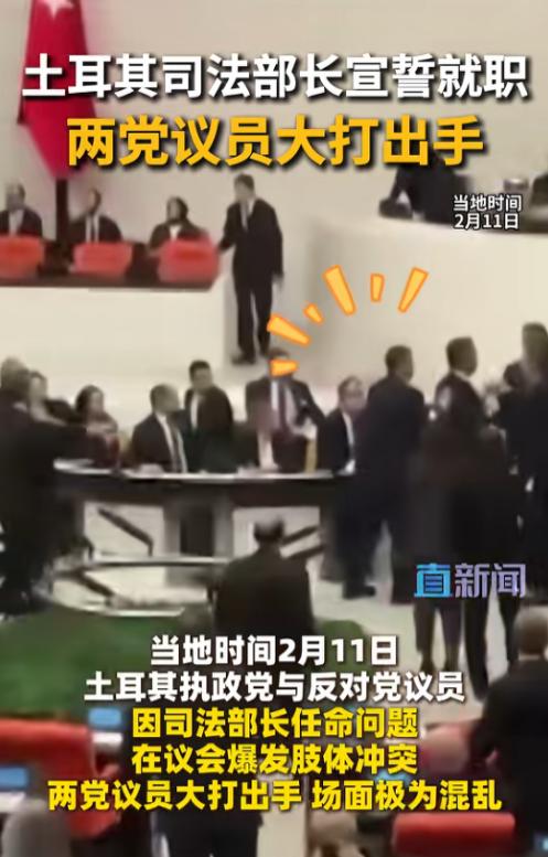 土耳其议会直接开打,虽然见过吵架的,见过拍桌子的,但在庄严议会大厅里,一群西装革履的议员直接大打出手的场景还是极少见的,就在2月11日,土耳其首都安卡拉的大国民议会里,就上演了这么一出全武行。 事情的起因,是总统埃尔多安要换个新的司法部长,提名了一个叫居尔莱克的人。 这人来头不小,之前是伊斯坦布尔的首席检察官,干过一件让反对党恨得牙痒痒的事,主导起诉了反对党共和人民党的好几个大佬,包括他们的前市长伊马姆奥卢,案子多达142项。 而反对党直接开骂,说这些都是“政治迫害”,这个新部长就是个“政治工具”。 所以,当居尔莱克走进议会准备宣誓就职时,反对党议员们彻底炸了,他们直接从座位上冲了起来,一窝蜂地涌向主席台,摆明了就是要拦着他宣誓。 可执政党正义与发展党的议员也不是吃素的,立刻围成了一道人墙,死死护住居尔莱克。 接下来的场面,就彻底失控了,推搡、拉扯、拳头乱飞,原本应该唇枪舌剑的议会,瞬间变成了拳击台。 有视频里能看到,反对党议员马赫穆特・塔纳尔的鼻子都被打破了,鲜血直流,议长一看这架势,赶紧宣布休会15分钟,先把场子镇住再说。 等秩序好不容易恢复,居尔莱克还是在执政党议员的簇拥下,完成了宣誓。 其实这事儿根本就不是一场简单的“斗殴”,而是土耳其政坛矛盾彻底激化的缩影。 当司法部长的任命本身就充满了争议,当反对党觉得自己的声音被完全无视,当执政党觉得 “程序对了就是一切”,那最后能解决问题的,就只剩下拳头了。 这事儿也给所有人提了个醒,当一个国家的司法系统被贴上“政治工具”的标签,当议会里的辩论变成了肢体冲突,最后受损的,是整个社会对法治和民主的信任。