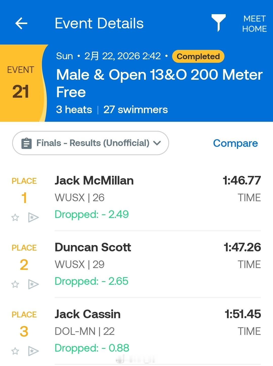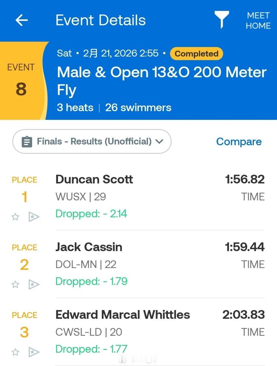 McCullagh International Meet 男200自:🇬🇧Jack McMillan 1:46.77男200仰:🇮🇪John Shortt 1:57.24男200蝶:🇬🇧Duncan Scott 1:56.82