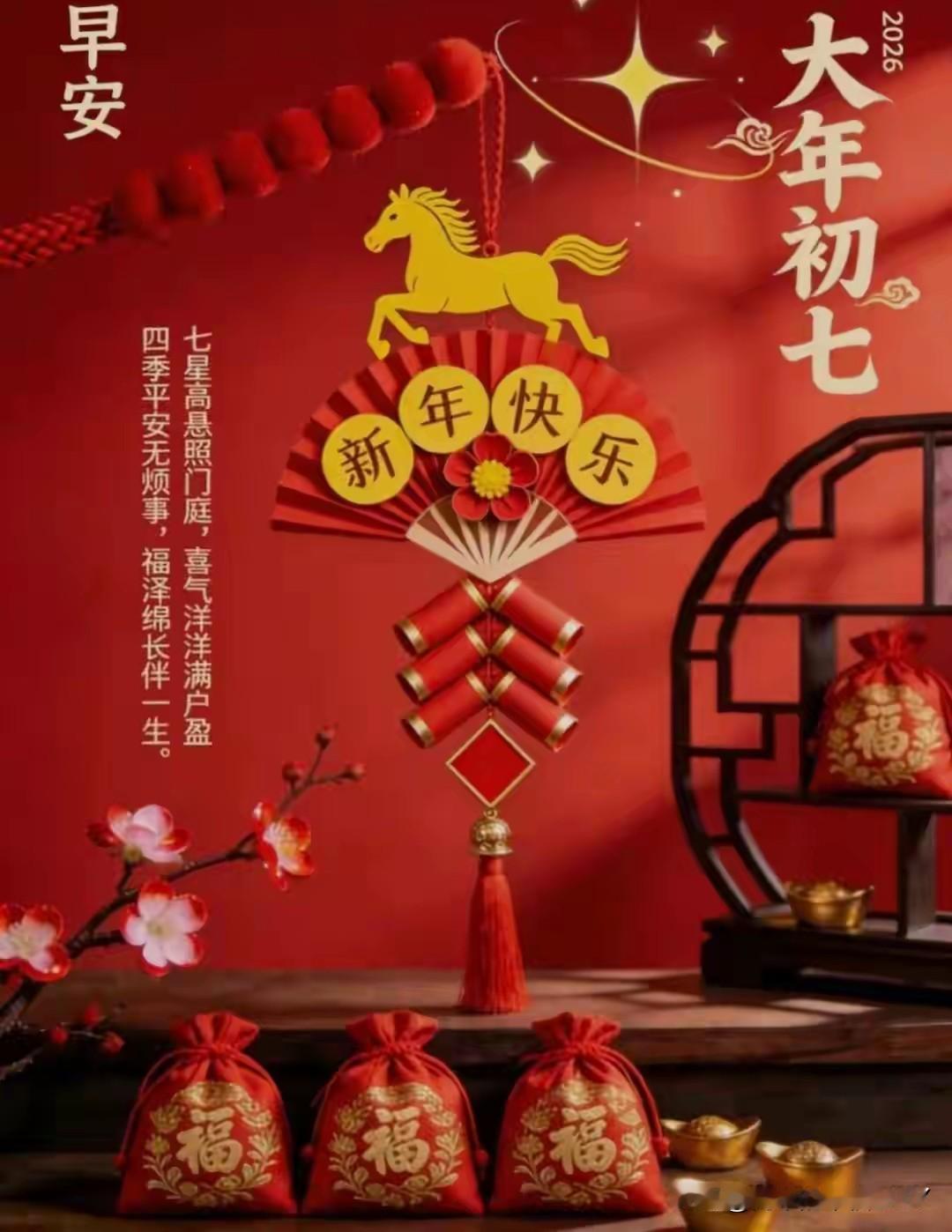 大年初七,人日逢春。晨光熹微,唤醒了人间新岁的烟火气。愿你借这七日的吉庆,揽一怀早春的清欢。 这七日的热闹还没散尽,灯笼在檐角晃悠,红纸上的“福”字沾着露水。不如借这股子吉庆,拾一捧早春的暖意。 墙角的梅花开得正俏,枝头的嫩芽憋着劲儿冒头,日子就该这样,带着点清清爽爽的盼头。 过去的事儿,该放就放了吧。那些没做成的事、没说出口的话,就像除夕燃尽的烟花,散在风里便罢。 晨光爬上窗棂的时候,不如铺开新纸,把心里的念想一笔一画写下来,念头落了笔,就有了方向。 丙午马年的脚步轻快,正适合往前闯。老话说“人勤春早”,趁着这股子劲儿,把懒筋抻一抻。 想去的地方,抬脚就走;想做的事,别等“改天”。就像奔袭的骏马,踩着花影往前跑,沿途的山海都是风景。 心里揣着花,眼里才能看见春。柴米油盐里藏着细碎的甜,雨打窗棂时能听出诗意,日子再忙,也别忘了抬头看看月亮。 把寻常日子过出滋味,才是真本事。新的一天开始了,愿你兜里揣着阳光,脚下踩着坦途。 出门遇着笑脸,回家有热饭等。这一年,不慌不忙,稳稳当当,把每一天都过成值得的模样。 早安,新岁。顺遂,长安。