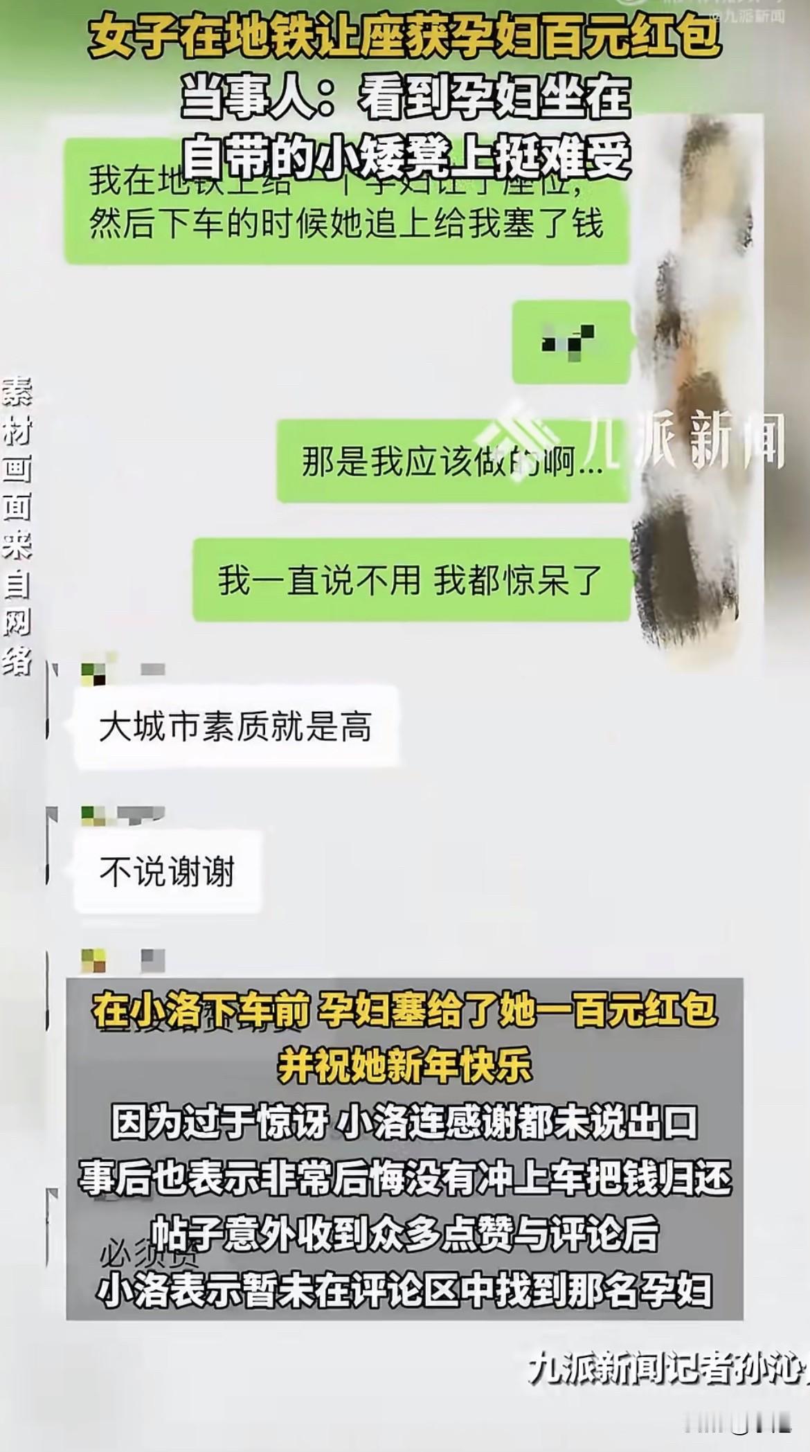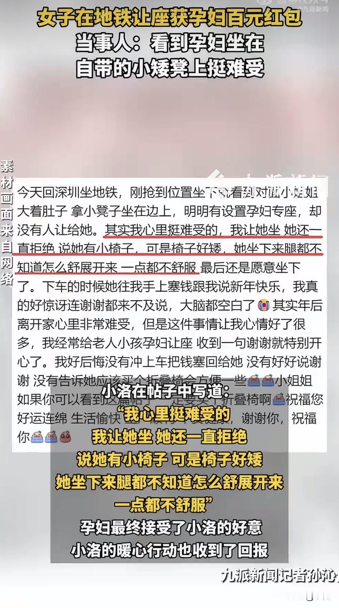 真的没想到,一个一百块钱的红包,能让全网这么多人在大半夜心里暖一下。 2月21号晚上七点多,深圳地铁5号线布吉站,网友小洛刚上车找了个座儿,一抬头就看见个穿灰裙子的孕妇。那孕妇没坐座位,自己从包里掏出一个黄色的小矮凳,缩在车厢角落里坐着。 小洛多看了两眼,发现车厢里头那个粉红色标识的“孕妇专座”上,坐了个大小伙子,一直低着头看手机。再看看那个孕妇,肚子已经挺明显的了,窝在那个巴掌大的小凳子上,地铁一晃,身子就跟着一歪,两条腿蜷着,想伸直都没地儿放。 小洛后来说,她当时心里特别不好受,直接就站起来过去让座。 那孕妇愣了一下,连连摆手说不用,说自己带了椅子,坐这儿就挺好。小洛没走,低头看着那个小矮凳跟她说,这凳子太矮了,你坐着腿都伸不开,多难受啊。就这么劝了两句,孕妇才不好意思地站起来,道了好几声谢才坐到小洛的位置上。 过了几站,小洛要下车了。她刚走到门口,那孕妇突然跟了过来,一把拽住她的手,往她手里塞了个红包。小洛低头一看,是张崭新的红票子,一百块。 孕妇冲她笑了笑,说了句新年快乐。 小洛当时整个人都懵了,拿着红包站在车门口,连谢谢都忘了说。车门滴滴响了几声就关上了,车开了,她还站在原地愣神。她后来发帖子说,自己特别后悔,当时就应该直接冲上车去,死活得把钱还给她。 那个帖子发出去之后,一夜之间点赞过了万。评论区里说什么的都有。 有人说自己也怀着孕,坐地铁从来没被人让过座,有时候只能往角落里头站一站,不好意思开口。还有人说,看见过有人带这种小马扎坐地铁,看着都心酸,可人家估计也是没办法,站不动,又怕没人让座,只能自己备一个。 小洛后来想再找找那个孕妇,想跟她说一声,下次别带这种矮凳子了,换个能收起来的折叠椅,坐上去能舒服点,也稳当点。 那个孕妇出门为什么要自己带个凳子?她是不是早就习惯了没人会抬头看她一眼?她包里一直揣着那个红包,是不是早就想好了,万一今天有人愿意让她坐,她就用这种方式说声谢谢? 一百块钱,一顿快餐的钱。可那个孕妇塞过去的时候,心里想的可能是,谢谢你没让我在那个矮凳上,继续窝着。 现在地铁里那么多人,下班点大家都累,都低头刷手机。可那个粉红色的孕妇专座,到底该谁来坐?是等着别人自觉,还是得有人站出来开这个口? 这事,你们怎么看?