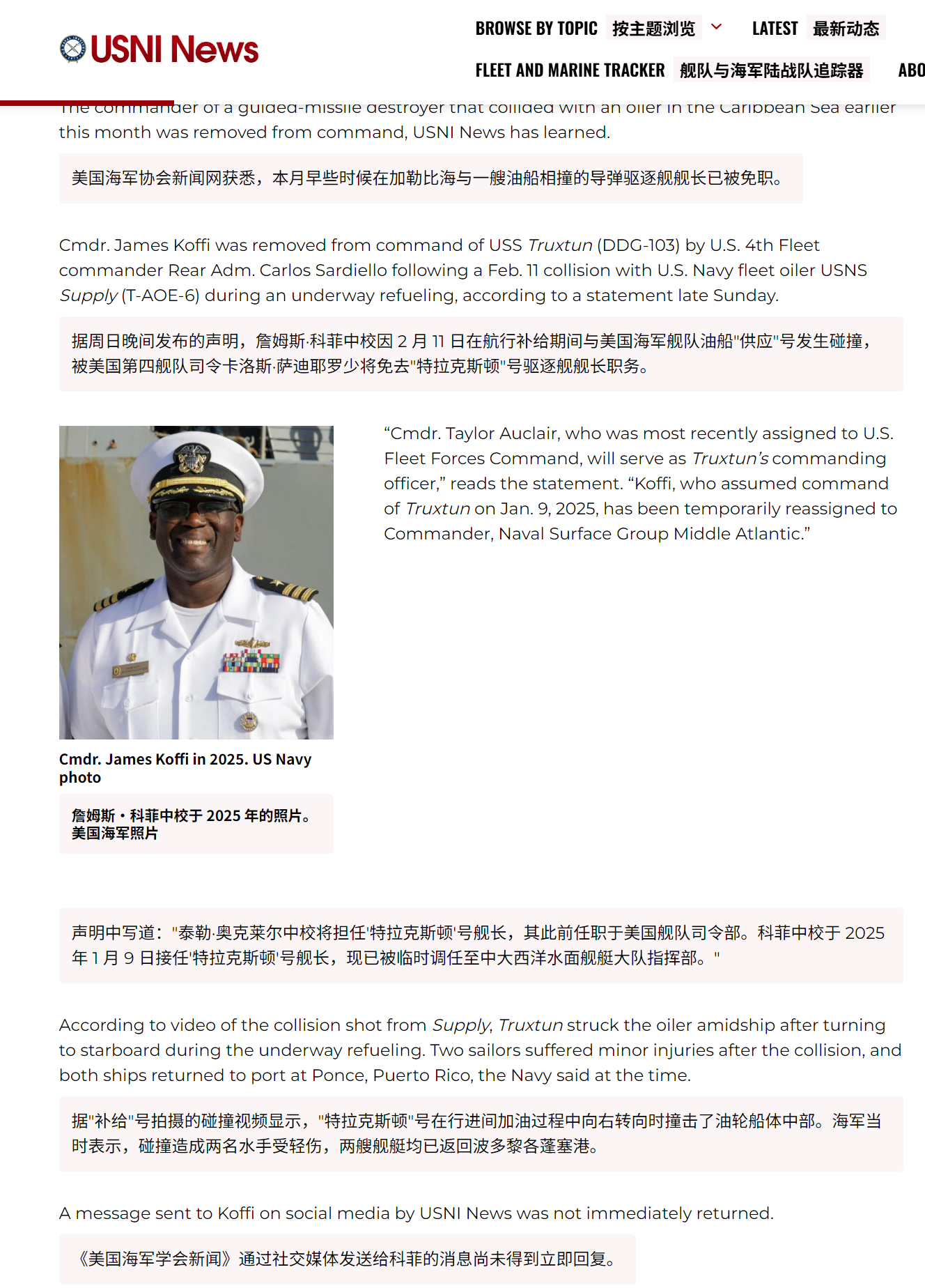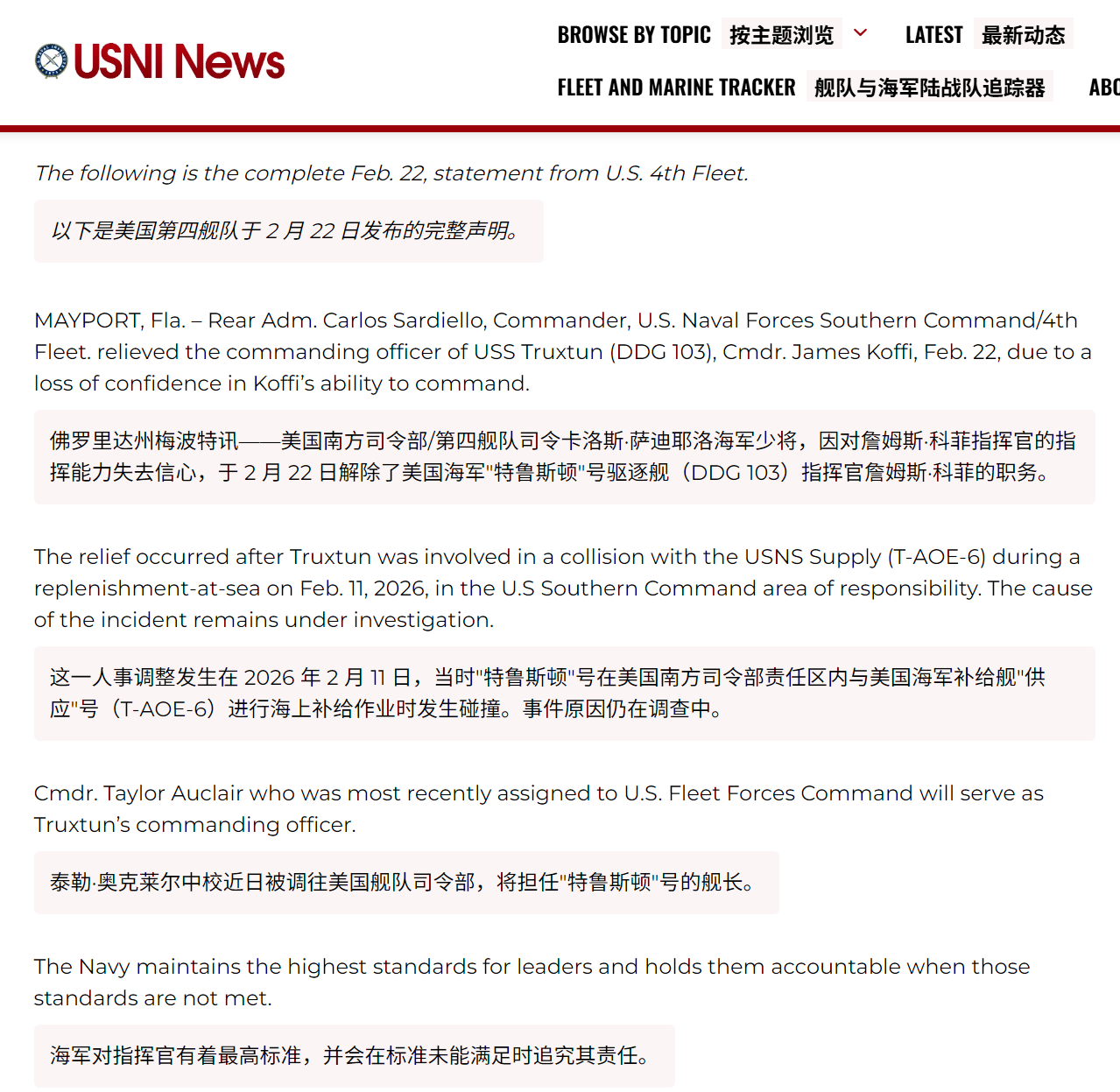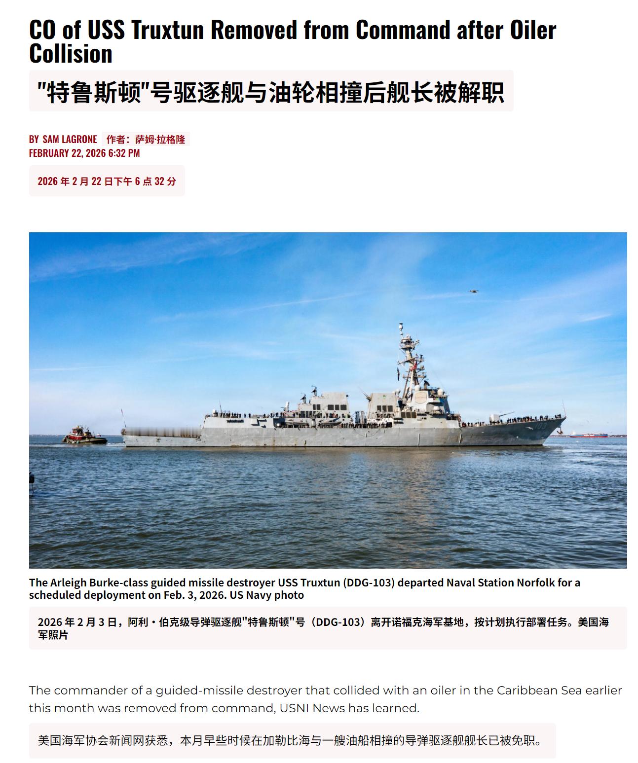 🔻在加勒比海撞船的特鲁斯顿号驱逐舰长詹姆斯·科菲中校被解除职务。🔻“美国南方司令部/第四舰队司令卡洛斯·萨迪耶洛海军少将,因对詹姆斯·科菲指挥官的指挥能力失去信心,于 2 月 22 日解除了美国海军特鲁斯顿号驱逐舰(DDG 103)指挥官詹姆斯·科菲的职务。”🔻via USNI news热点现场海外新鲜事