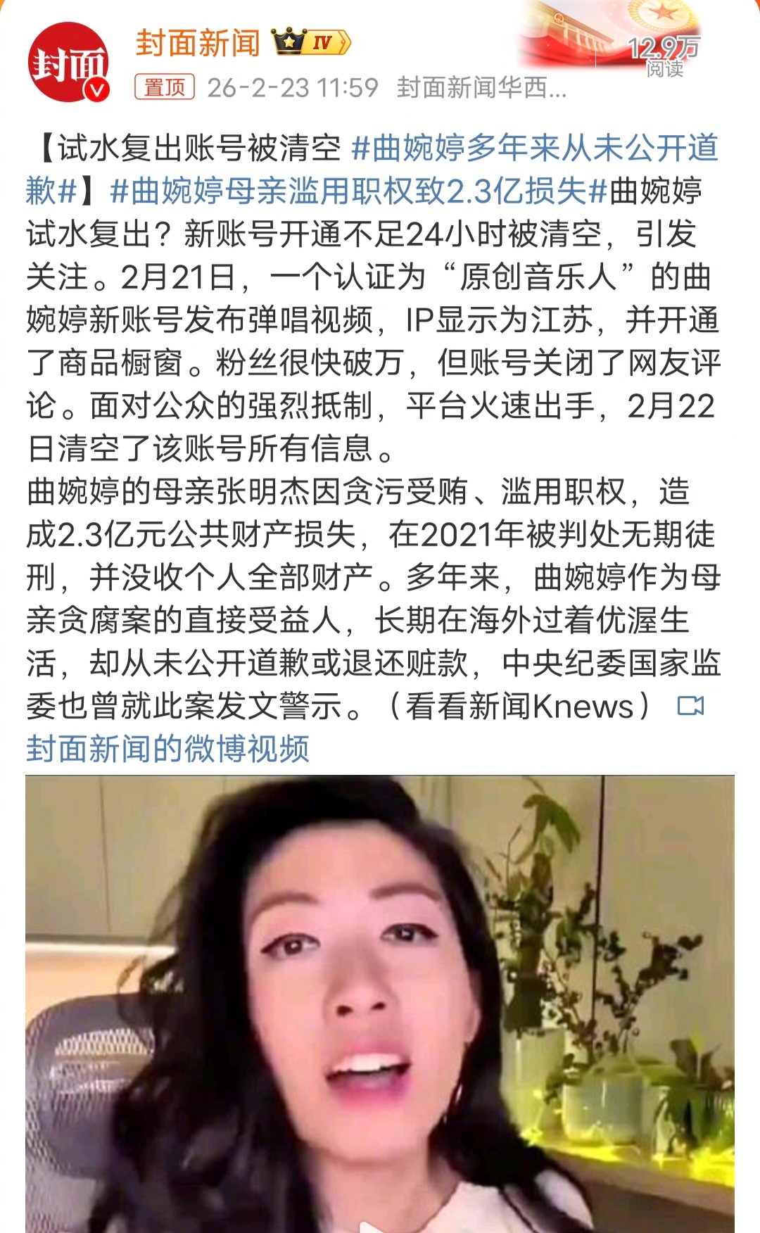 曲婉婷母亲滥用职权致2.3亿损失2.3亿都让曲婉婷在加拿大挥霍了