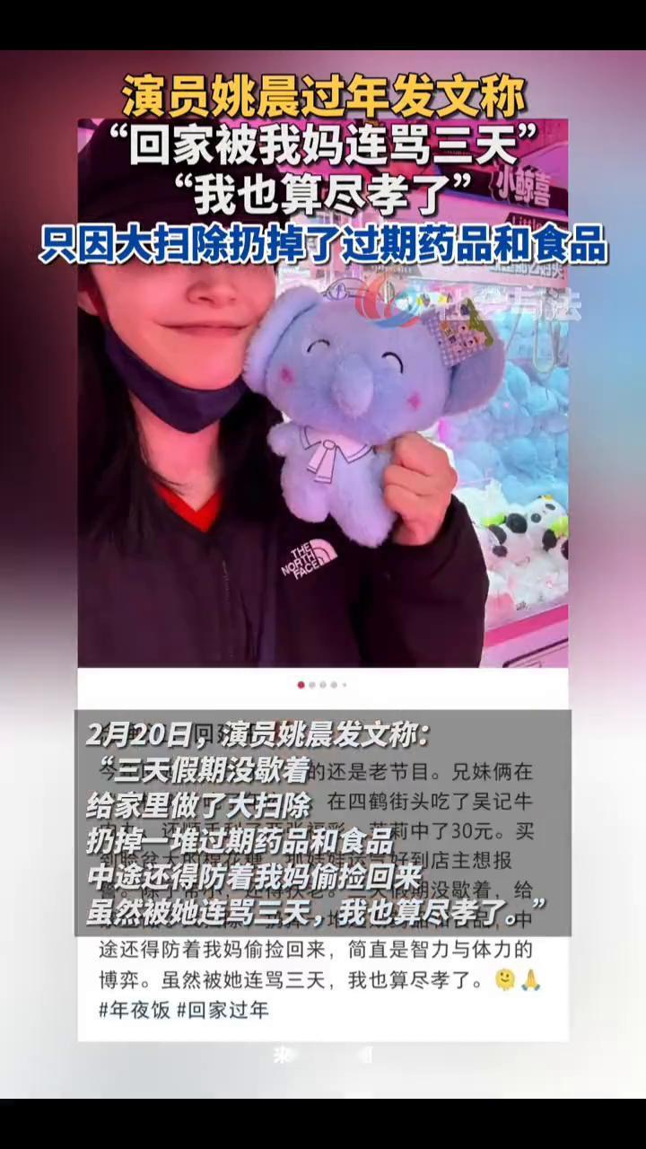 演员姚晨过年发文称:"回家被我妈连骂三天","我也算尽孝了",只因大扫除扔掉了过期药品和食品。 2月20日,演员姚晨发文称:"三天假期没歇着,给家里做了大扫除,扔掉一堆过期药品和食品,中途还得防着我妈偷捡回来。虽然被她连骂三天,我也算尽孝了。" 不少网友表示"俺也一样",父母家里囤了不少过期药品、食物,回家时偷偷扔掉。