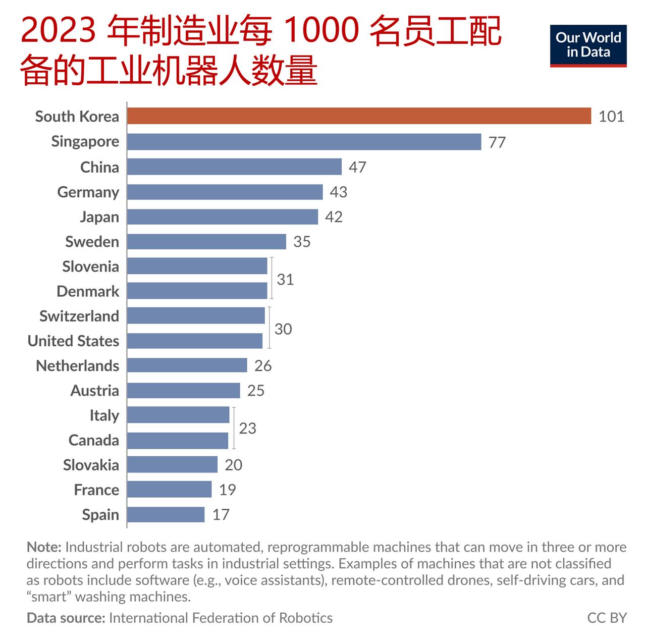 韩国每1000工人所配备的工业机器人数量超过任何其他国家 下面这张图表展示了一种比较各国自动化生产水平的方法——它将每 1000 名制造业员工所配备的机器人数量绘制成图表。 该图表显示了各国自动化生产水平存在着巨大的差异。韩国尤为突出,每十名制造业工人中就配备有一台机器人。 新加坡位居第二,中国排名第三,与德国差距不大。美国处于中间位置,接近欧洲平均水平,低于瑞士、丹麦和斯洛文尼亚。 这种观点是从相对量的角度来阐述工业机器人应用情况的。在另一项数据洞察中,从绝对量的角度对机器人应用情况进行了研究。从这个角度来看,中国表现尤为突出:它是一个经济规模庞大的国家,拥有庞大的制造业,而且其工业机器人的存量也是目前最大的。 这一增长大部分是在近期发生的:中国每年的机器人安装量在十年间增长了 12 倍,这使得其在每个工人配备机器人数量方面快赶上了韩国。
