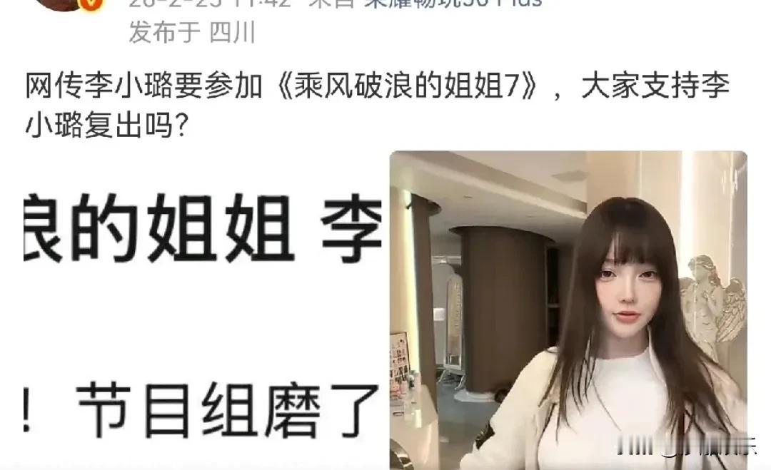 李小璐,冲上热搜! 李小璐惊爆加盟《浪姐7》!节目组苦等半年,这次复出能成吗? 2月23日,打开热搜,李小璐的名字猝不及防地蹦了出来。点进去一看,好家伙,网曝她要去《乘风破浪的姐姐》第七季了!据说节目组挺有诚意,磨了小半年才把合作敲定 。 说实话,看到这个消息,我心里五味杂陈。一方面,脑子里立马闪过她当年在舞台上又唱又跳的灵动劲儿,毕竟17岁就是金马影后,底子在那儿摆着 。现在她44岁还能保持那种少女感,为了练舞肯定没少流汗,业务能力这块,如果真的站上浪姐舞台,确实让人好奇会是什么样 。 可另一方面,评论区直接吵翻了天。有人期待,说这是“有生之年”系列;但更多的是坚决抵制,翻出旧账觉得她不适合再出来。这种两极分化,真是隔着屏幕都能感受到火药味 。 其实这几年,虽然没在电视上见过她,但在直播间和短视频里,她一直挺折腾的,搞服装品牌、带女儿甜馨,那股不服输的劲头让人不得不服 。有人骂她,也有人觉得她活得真实。 这次要是真能成行,对李小璐来说绝对是背水一战。咱们吃瓜群众也别急着站队,毕竟生活已经够累了,看点唱唱跳跳的节目,如果能开心,又何尝不可呢?大家怎么看,她该不该上这个节目?