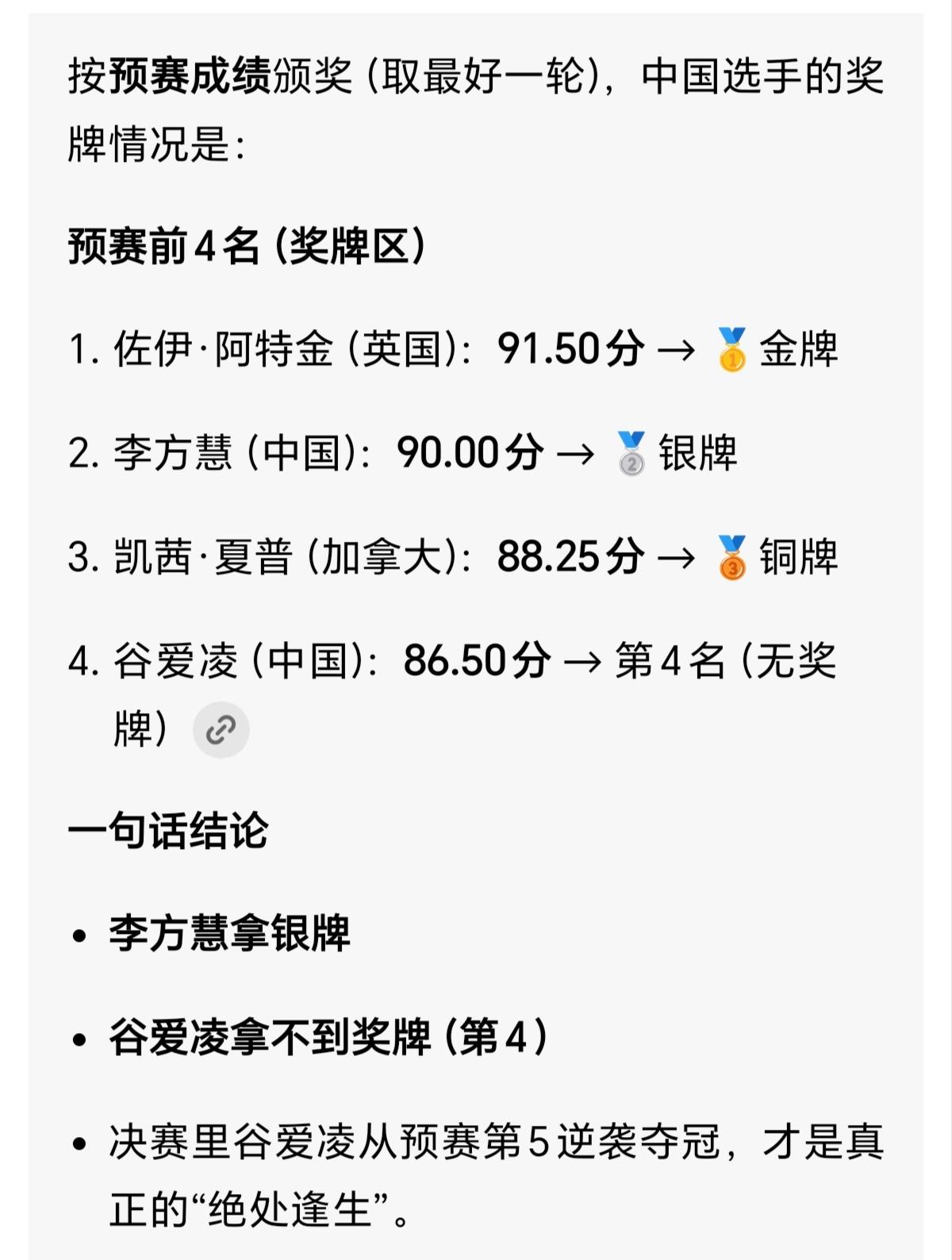 李方慧与谷爱凌一同站在领奖台上,是自由式滑雪U型场地赛略逊于谷爱凌的亚军。由于天气原因,最后的决赛差一点取消,如果取消决赛,李方慧也能保亚军,而谷爱凌就没有奖牌了金牌就是英国的阿特金。 但是最后一天米兰的天风轻云淡,给了谷爱凌绝处逢生的机会,谷爱凌笑到最后赢得金牌,李方慧屈居亚军。 李方慧2004年出生,黑龙江通河人。2012年被教练选中,2013年进哈尔滨体工队,2016年入选国家队(不到13岁)。 北京冬奥会(2022):女子U型场地第5 名(86.50分)。 米兰冬奥会(2026):银牌(93.00分), 职业生涯首枚冬奥奖牌。 2025哈尔滨亚冬会:金牌(95.25分,中国代表团首金)。 2025世界杯卡尔加里站:首枚世界杯金牌,并列年度总冠军。 2026世界杯美国站:金牌。 李方慧实力是有的 ,只是在谷爱凌这个中美混血美女面前略逊一筹。也可能缺少国外训练的机会与经验。这是一项烧钱的体育运动,只有谷爱凌这样财富自由的人才能满世界适应训练。 一块奥运银牌对于来自农村的孩子已经是厚爱了,希望李方慧再接再厉,还有机会拼奥运金牌。