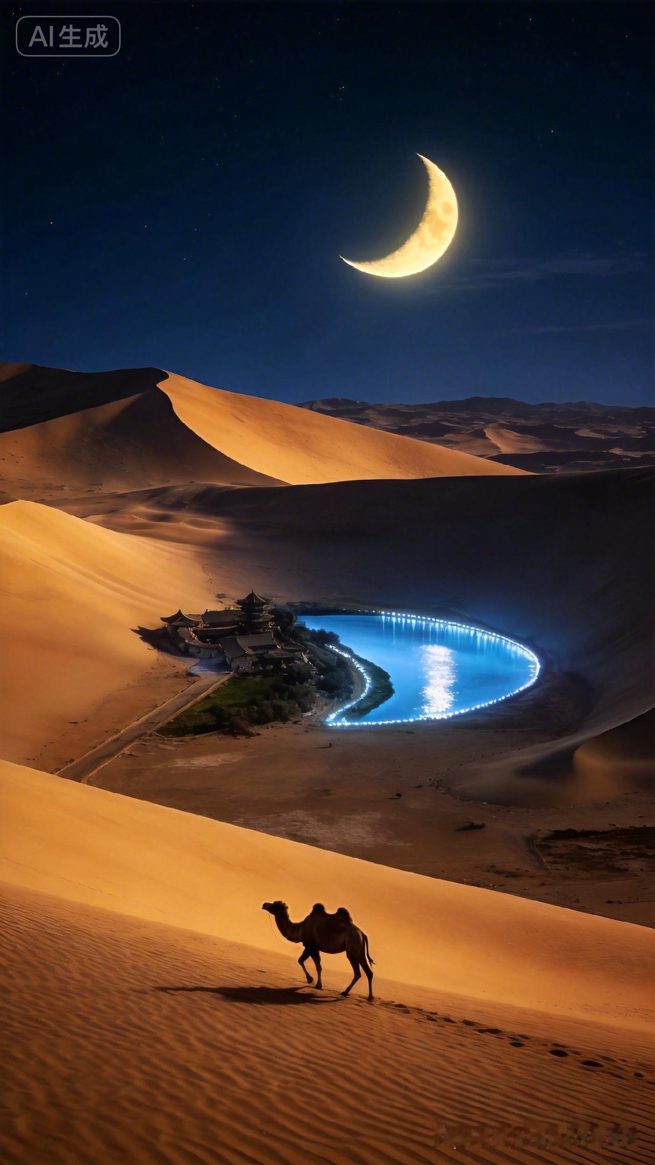 沙漠中的梦幻蓝湖,骆驼漫步其旁,月光如水,宛如仙境。