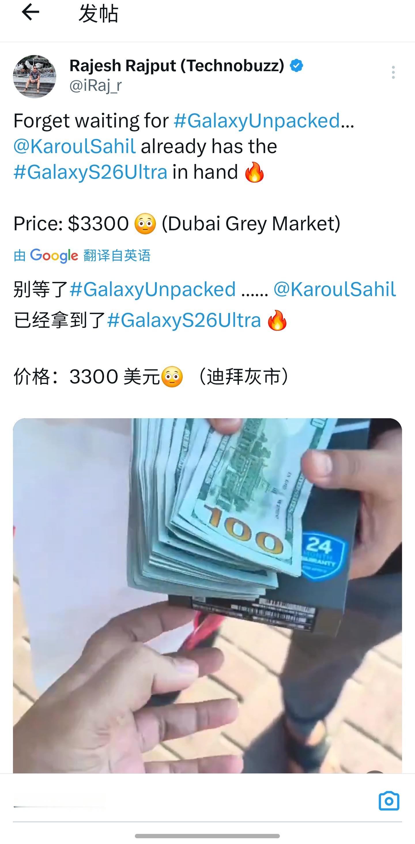 你们看到的Galaxy S26 Ultra上手视频,是这哥们从迪拜灰色市场花3300美元买到的,一手交钱一手交货,很快就拿到了。