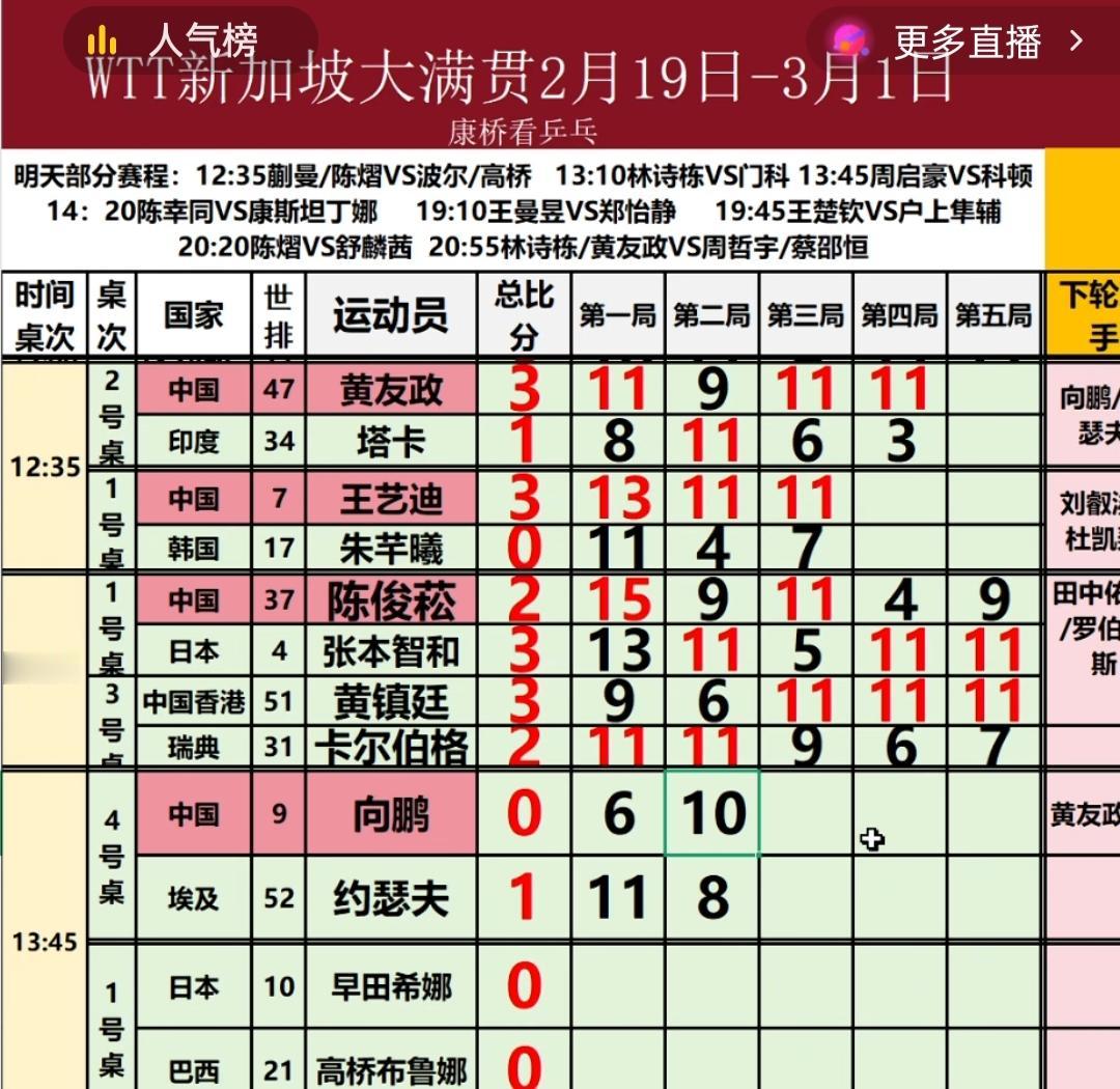 张本智和差一点儿一轮游!陈俊菘在乒球新加坡大满贯上败给了张本智和! 陈俊菘第三位一轮游!! 陈俊菘打的张本智和,第一局在9:7领先的情况下,叫了暂停,也现场换了球衣! 第一局,两位打的难分难解,最终陈俊菘15:13先胜!场外指导刘恒! 第二局,陈俊菘第二局开始打的挺好,曾3:0领先,结果心态起了变化,中局和最后打的有些保守,9:11败了,大比分1:1, 第三局,陈俊菘5:1开局,陈俊菘压着张本智和的正手开打,逼迫得张本智和转不开身,有劲使不出,9:2,11:5胜,陈俊菘大比分2:1暂时领先! 第四局,陈俊菘3:8落后,第三局打哑了的张本智和又吼起来了,看来要打决胜局了,4:11败,大比分2:2平! 决胜局,陈俊菘,4:2,张本智和又哑了,好似要哭了,4:4,5:4,7:5,8:7,8:9,8:10,9:11败,张本智和又吼起来了!!!