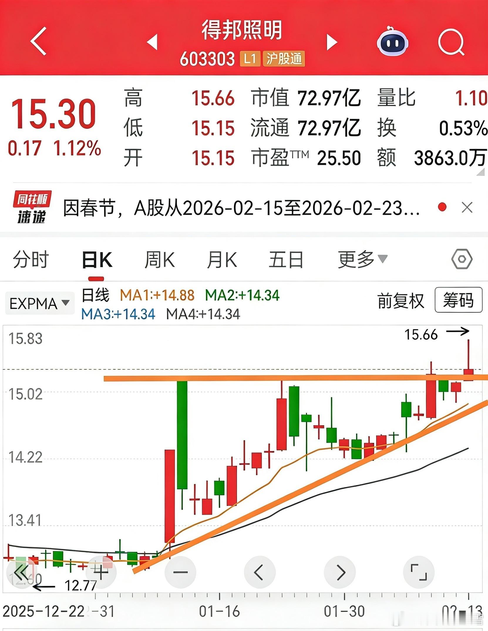 得邦照明自1月12日涨停启动,次日高开放量,随后以这段高低点为区间,走出近一个月震荡整理,底部逐步抬高,目前已走到三角形末端收敛位。