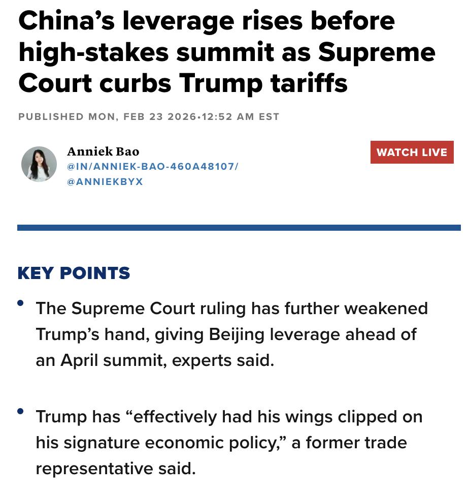 美媒:美国最高法院裁定特朗普的关税措施无效,这削弱了特朗普在即将到来的4月中美峰