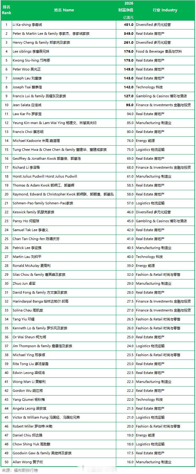 福布斯香港50大富豪,蔡崇信第8、刘炽平第27