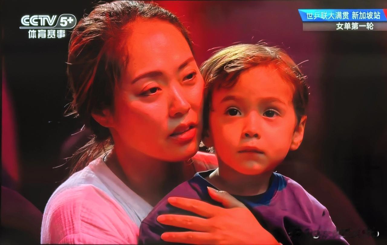 这年轻的母亲太温柔了,有点像蒙娜丽莎!每次不下五秒钟,镜头两次长时间的对着她们,中午王艺迪对阵朱纤纤的比赛、下午陈垣宇对阵达科都有她们的身影。母亲满满的宠溺全在孩子身上。小孩子是混血,大眼睛直勾勾的看着比赛。从小感受乒乓球,长大了肯定是世界冠军!没想到新加坡还有这样专注乒乓球的家庭!