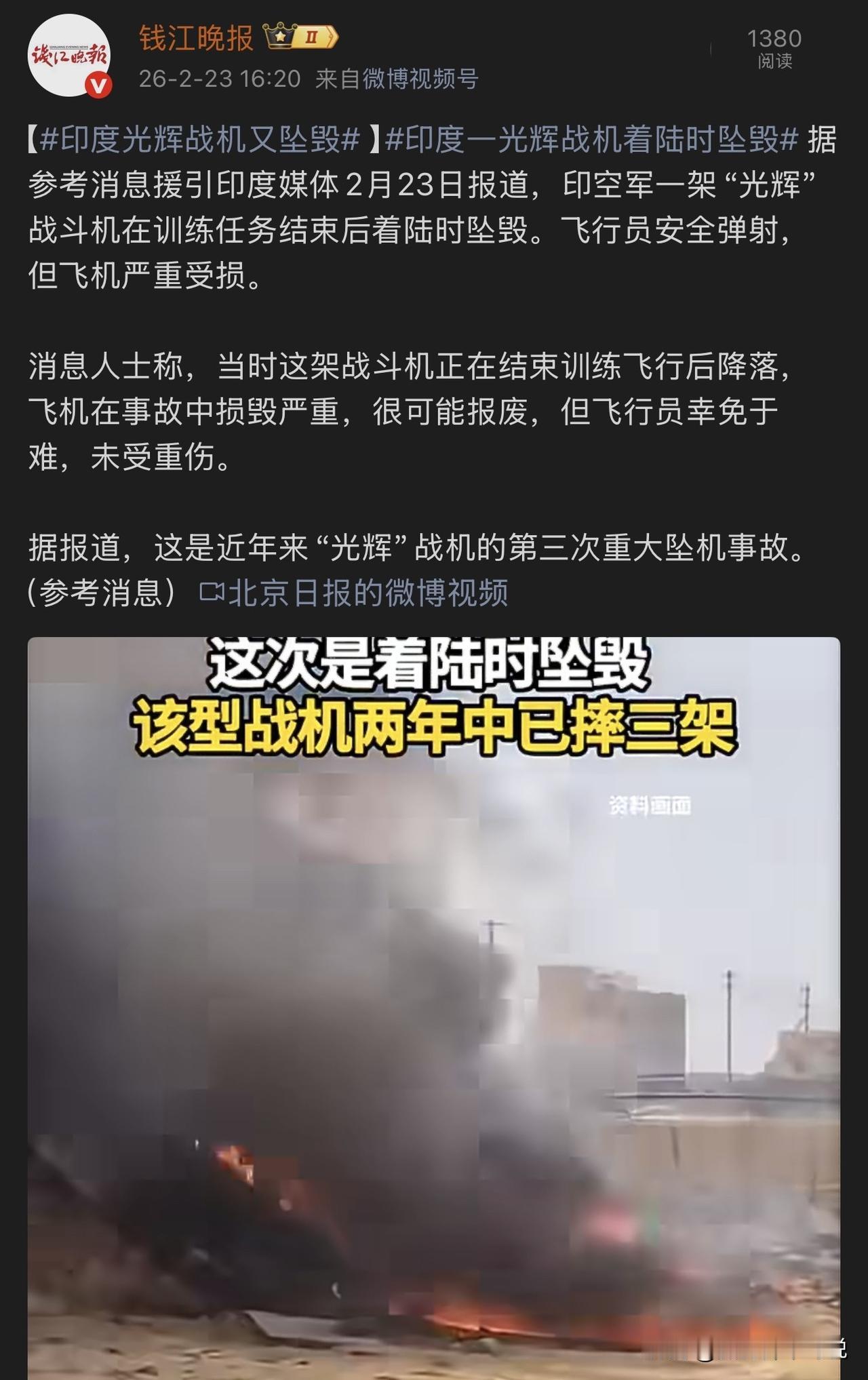 印度的战机又摔了,这次还是号称几十年0被击落记录保持者光辉战机。据印度媒体2月23日报道,印空军一架“光辉”战斗机在训练任务结束后着陆时坠毁。所幸飞行员逃生成功,但战机受损严重。按照印度维修战机的稳定发挥,损坏就意味着很快就会退役了,那么这架战机要么很可能修完后再次摔下来,要么沦为配件仓库。光辉战机这两年表现依然稳定的“光辉”,还记得去年的中东航展吗?当时还在展位上就被人拍到渗漏液体,管理人员用购物袋接液体。随后没两天就有报道说参展的某架光辉摔下来了,还害死了飞行员。这么看,印度近两年疯狂购买外国战机是有道理的。斯坦航空是不是该自我反省一下了?