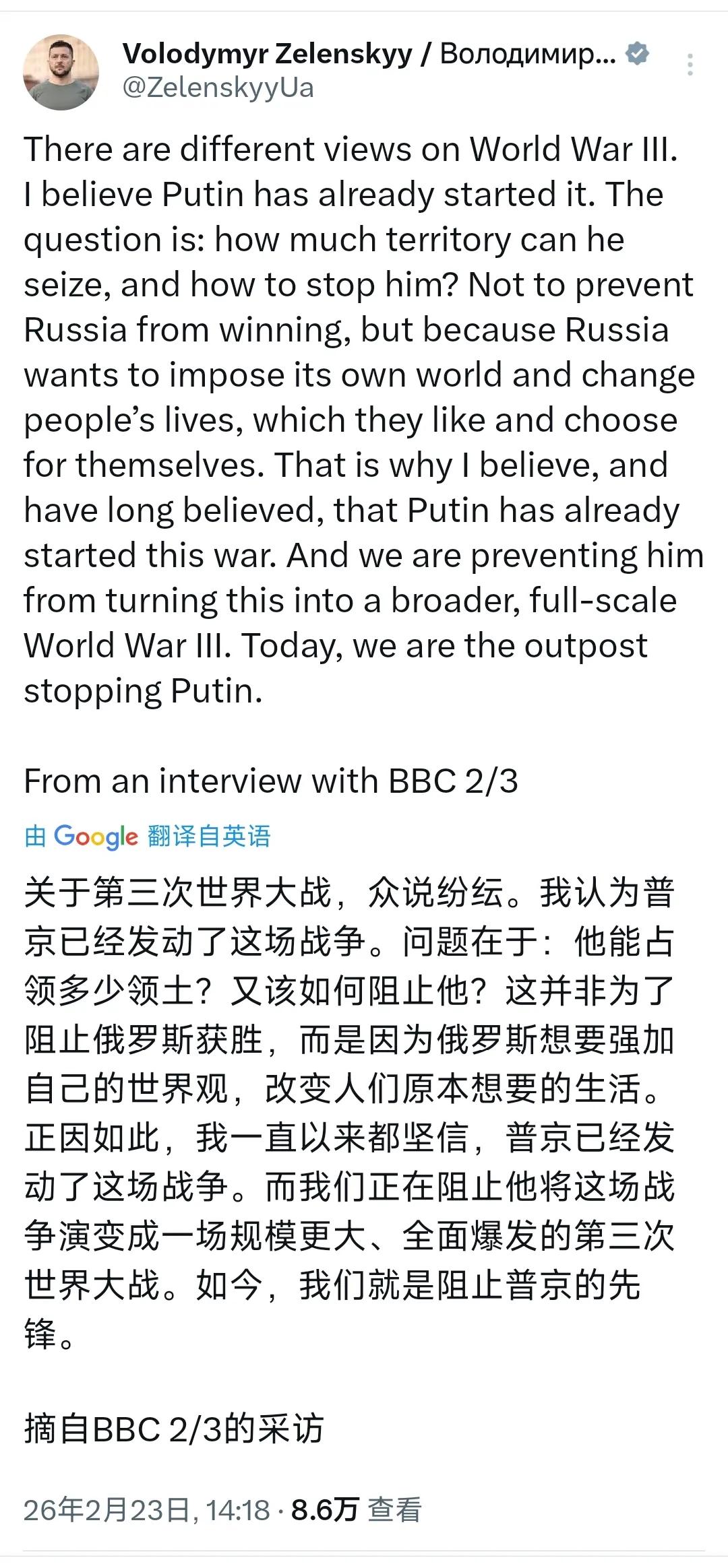 泽连斯基又发了一条爆炸性推文:普京已经发动了第三次世界大战 泽连斯基的核心逻辑