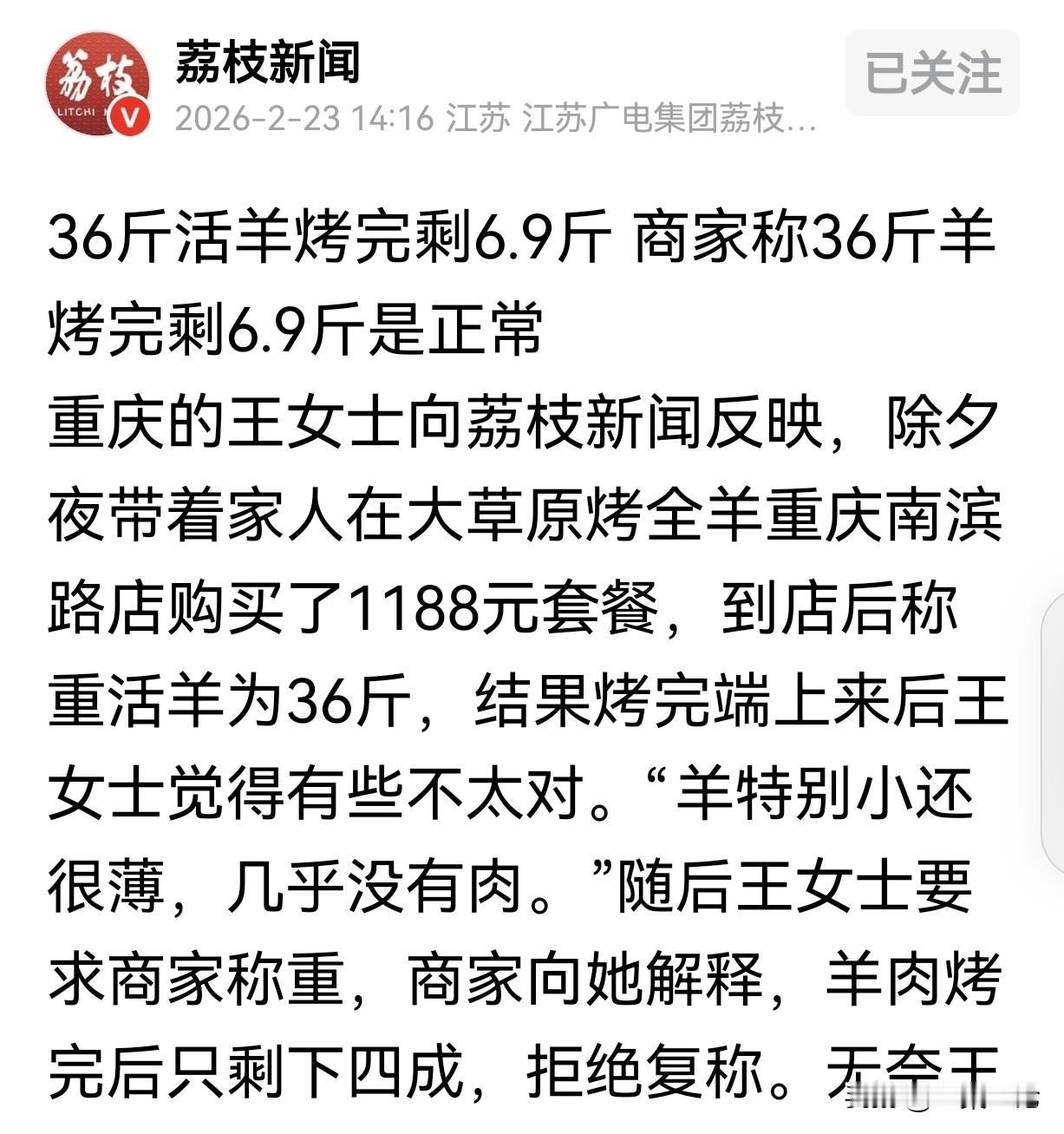 重庆,一女子花1188元,买了套烤全羊套餐,可万万没想到,36斤的活羊,烤熟后只有6.9斤,羊特别小还很薄,几乎没有肉全是骨头架子,她怀疑羊被掉包,或者被坑称了,要求店家复称,但店家说:活羊是当你面称的,你还在羊腿做了记号,羊肉烤完后只剩下4成,凭啥给你复称?女子一怒之下进行了投诉。 王女士怎么也没想到,除夕夜带着家人高高兴兴去吃烤全羊,结果却惹了一肚子气。 王女士一家选的是1188元套餐。到店后,商家当着王女士的面称了一只活羊,显示有36斤重。 王女士不放心,怕中途掉包,还在羊腿上做了记号,想着这羊肯定错不了。 等羊烤好端上桌,王女士一看就傻眼了。这羊特别小,还薄得像纸一样,几乎全是骨头架子,肉少得可怜,看着也就六七斤,哪够一家人吃呀? 王女士心里犯起了嘀咕,怀疑这羊是不是被掉包了?或者商家在称重的时候动了手脚坑了自己。 于是,王女士要求商家把烤好的羊肉再称一遍。可商家却一口拒绝,还理直气壮地说,活羊是当着王女士面称的,她还在羊腿做了记号,羊肉烤完后本来就只剩下4成,凭啥给她复称? 王女士听了这话,又气又急,这不明摆着耍赖嘛。 双方争执不下,王女士一怒之下报了警。帽子叔叔很快赶到了现场,在警方的要求下,商家这才不情愿地把烤好的羊肉复称了一下。 这一称可不得了,显示只有6.9斤重。王女士这下更生气了,36斤的活羊,烤完就剩这么点,这也太离谱了。 商家见事情闹大了,又开始找借口解释,说杀完羊去了内脏重量就只剩4成了,烧烤后羊肉重量还会缩水,肯定有损失,这都属于正常现象。 而且,王女士这只羊烤的干,所以重量才相差这么大。 可王女士根本不接受商家的这些说法。她觉得就算有损耗,也不至于损耗这么多啊。 36斤活羊烤完剩下6.9斤,这怎么算都不正常。她希望网友们能帮她评评理,看看商家是不是在坑人。 目前,王女士已向相关部门投诉了,正在等待主管部门介入调解。 以后出去消费,遇到这种涉及重量、数量的问题,一定要多留个心眼,最好能留下证据,万一遇到像王女士这样的情况,也好维护自己的合法权益。 有人说,出肉率大概不到一半,也就是不到18斤,烤熟了,剩40%,最多剩7.2斤,大差不差! 活羊应该是吃饱喝足了以后称重的,36今可以以出12斤羊肉,羊肉烤干后重量减少40%,也是正常的。 土话有“羊半头”的说法,意思是说一只羊的重量经宰杀后称重,是宰杀前的一半。不知对否。 自己算,活羊宰杀之后去掉头蹄下水重量基本是三七开,三十多斤的小羊骨肉四六开,烤熟重量基本上也是四六开,这是秋天羊的重量,十一月到来年青草出来之前是越来越瘦,出肉量还要打点折扣,纯肉这个重量正常,至少在草原上是正常的。 王女士这遭遇着实闹心,花高价买烤全羊套餐,结果活羊36斤烤完只剩6.9斤,这换谁都得怀疑被坑。 商家先是以当面称重、做了记号为由拒绝复称,后又找各种理由解释重量差异,很难让人信服。 虽说有人觉得按照一定出肉率和烤制损耗算,这重量或许正常,但商家在事前并未清晰告知消费者这些情况,消费者基于对商家的信任消费,结果却大失所望。 而且商家一开始强硬拒绝复称的态度,实在有逃避责任之嫌。 消费者在消费时往往处于信息弱势地位,商家有义务提前将可能影响消费体验的关键信息,像出肉率、烤制损耗等明确告知。 这样既能保障消费者的知情权,也能避免后续不必要的纠纷。 王女士积极维权的行为值得肯定,这不仅是为了自己讨个说法,也是对不良商家的一种监督。 希望相关部门介入后能彻查此事,给王女士一个公正的结果,也规范一下商家的经营行为,让消费者能放心消费。 《消费者权益保护法》第8条规定,消费者享有知悉其购买、使用的商品或者接受的服务的真实情况的权利。 此案例中,商家没提前清晰告知消费者活羊出肉率及烤制损耗等关键信息,侵犯了消费者的知情权,应承担相应责任,相关部门可据此要求商家整改并处理纠纷。 对于这件事,你怎么看? 欢迎关注@一案一论