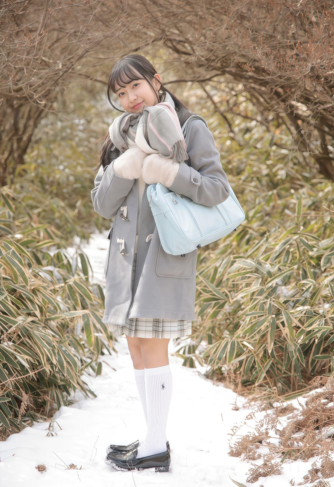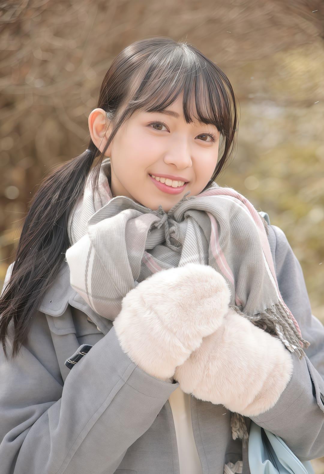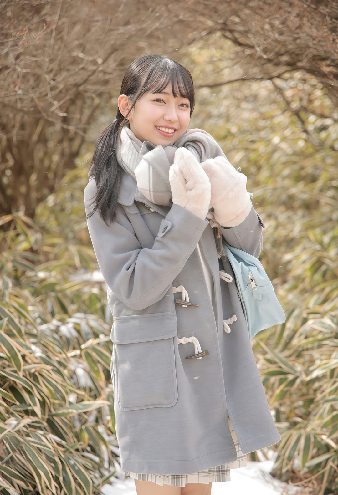 冬日暖阳下,少女漫步在雪地中,笑容如花般绽放。