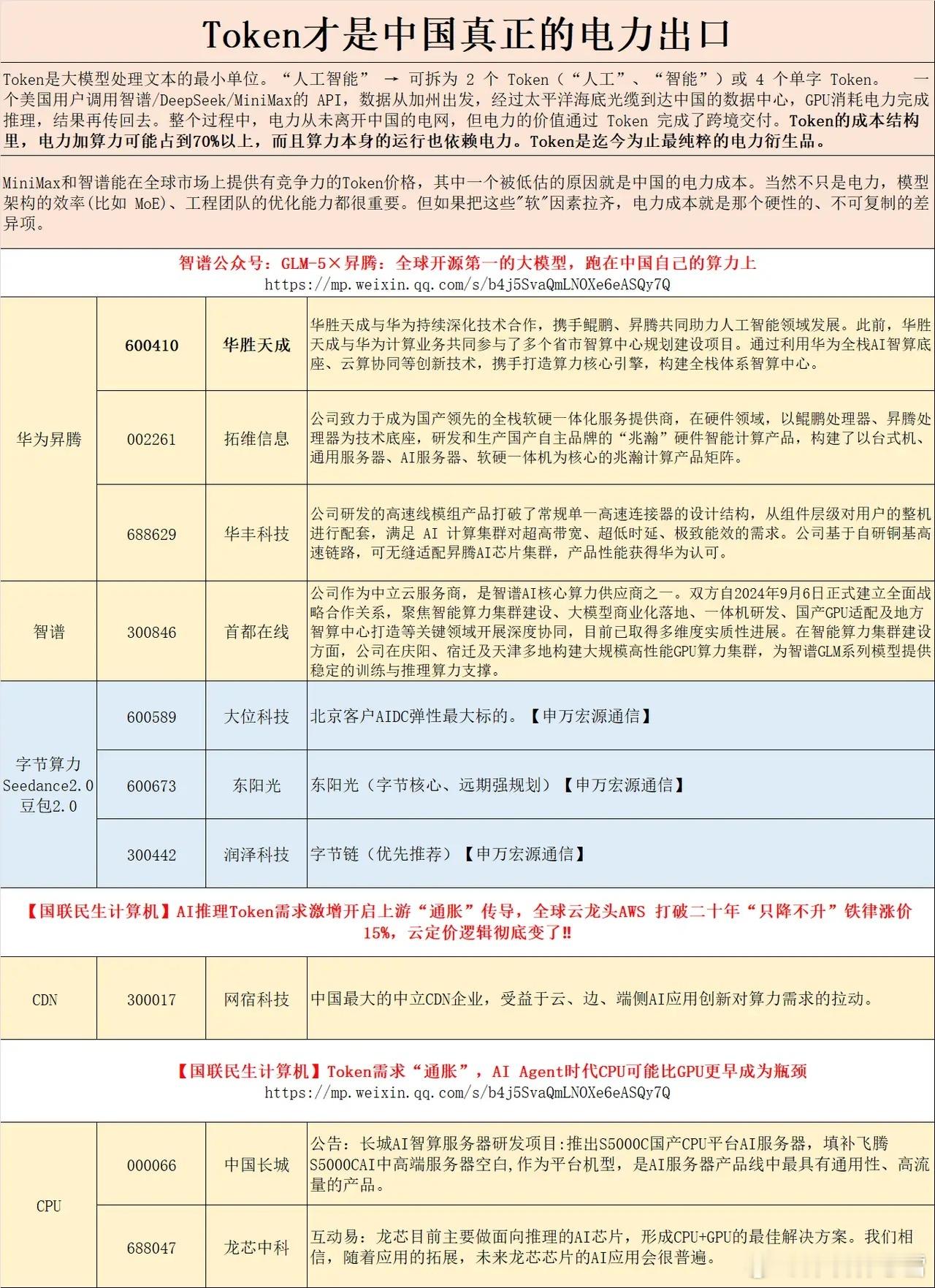 电力与算力占Token成本超70%,成本优势决定全球竞争力。当前,智谱AI已全面深度适配国产芯片,依托国产化算力实现显著降本;MiniMax模型成为全球Token消耗量最大的模型,同等能力下Token定价仅为国际同类一半,成本与规模双领跑。