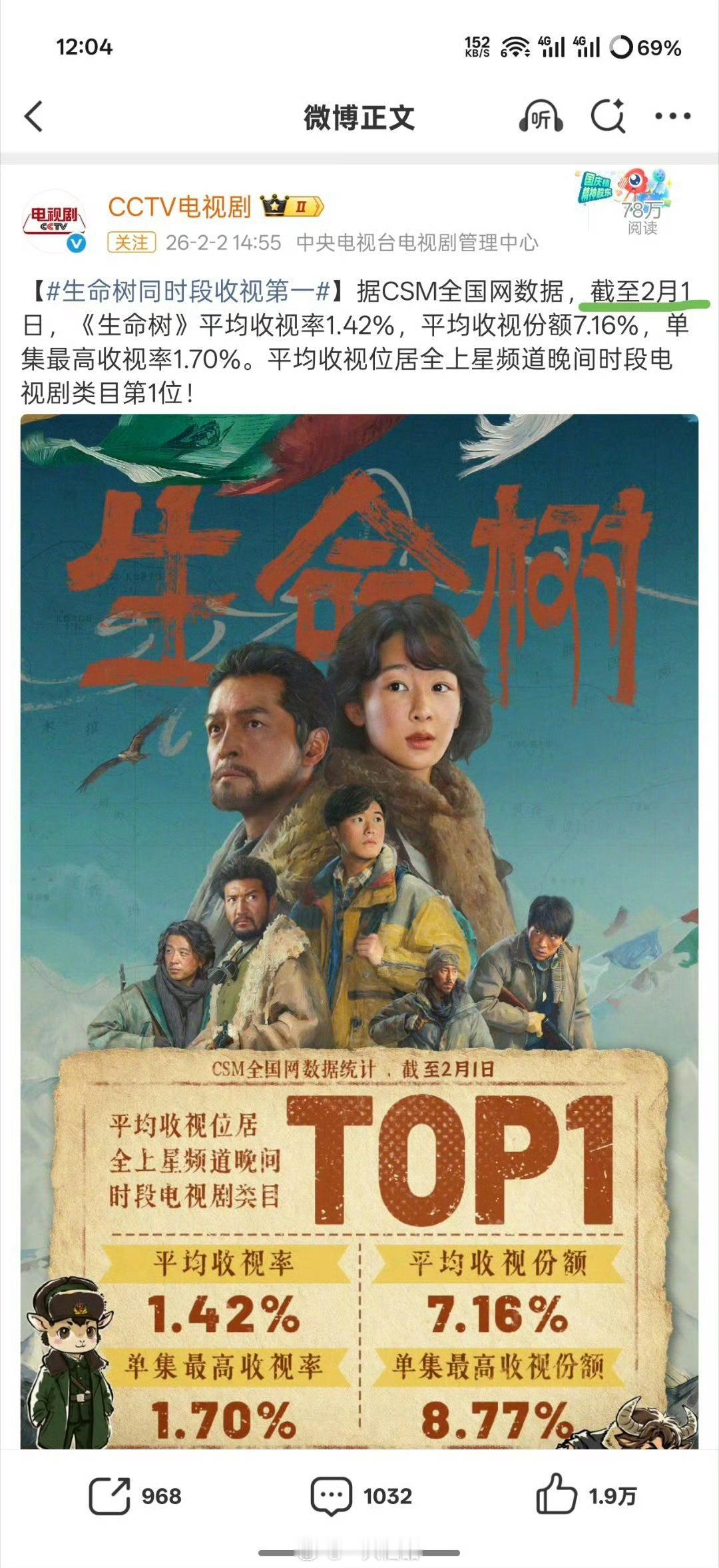 生命树官博发布的生命树收官战报中csm数据与央视2.2发布的截止2.1号的数据一致,1.42%。官博用前三天的csm数据来代替全剧平均csm,这算混淆事实吧?