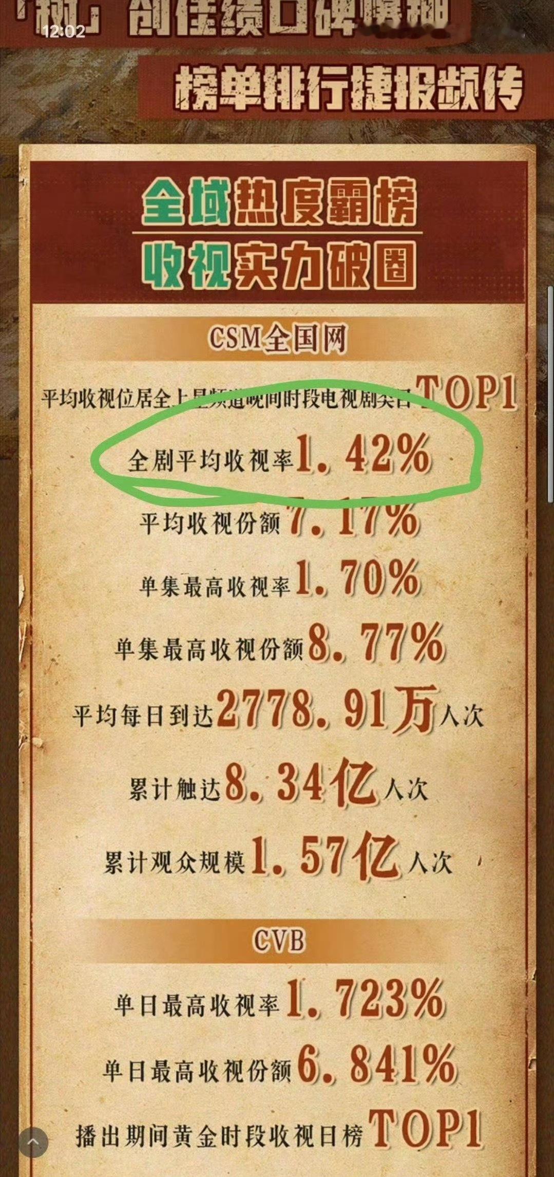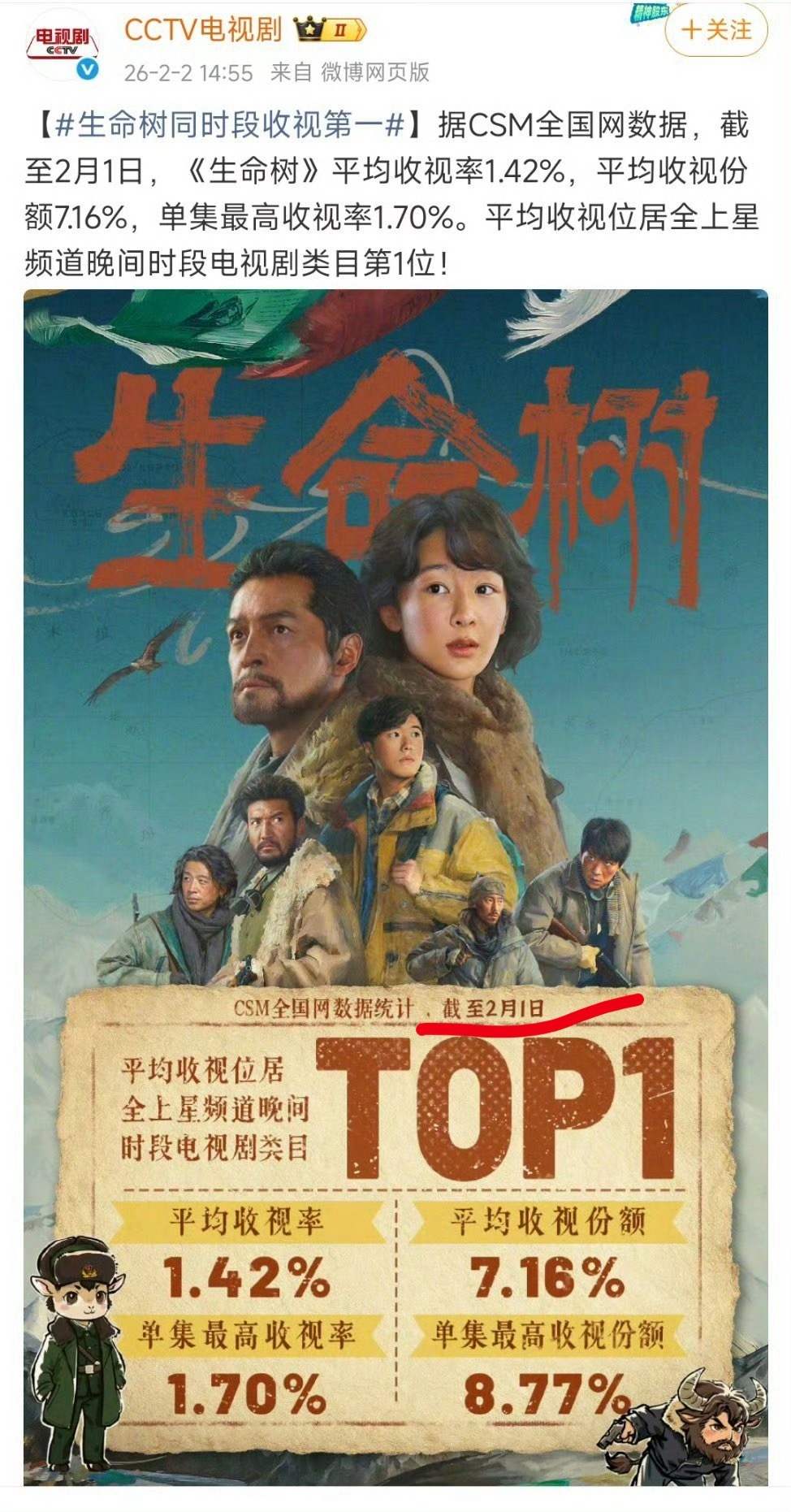 生命树收官战报有争议哎❗️央视发布截至2月1日(播完三天/6集)CSM平均收视率1.42%而官方发的是全剧平均收视率是1.42%到底哪个是正确的啊❓