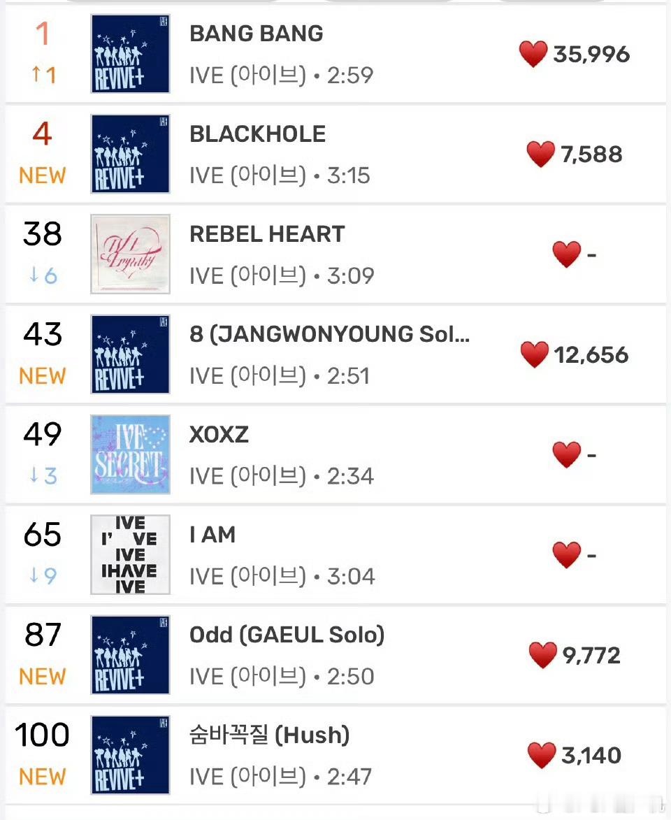 IVE正规二辑空降主打曲《BLACKHOLE》Melon实时4位,带动先行曲张元英solo曲43位秋天solo87位收录曲Hush 100位