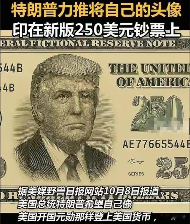 美国历史上第一位“250”总统即将诞生,就是当今美国总统特朗普,他要求在钞票上印上自已的肖像,一般钞票上印的是对国家有贡献总统,并且都已过世,特朗普到好,为了自已“荣耀”,他不管这些,显示自己的威望,好不好笑,而且钞票面值是250美元,要自己250流芳百世。 按照美国惯例,钞票上印的都是对国家有重大贡献、且已经过世的总统,这是约定俗成的规矩,更是对历史与功勋的敬畏。 可特朗普偏不按常理出牌,为了给自己博荣耀、树威望,完全无视传统与规则,活着就要把自己印上钞票,还专门挑了250这个极具“深意”的数字,摆明了要让自己“250流芳百世”,这操作简直刷新全球认知,荒诞又可笑! 一边是开国总统们用一生功绩换来印钞殊荣,一边是特朗普活着就急着给自己“留名”,连基本的体面都不顾,只为满足一己虚荣心。 250美元钞票一旦面世,不光是美国货币史的笑话,更是国际社会的谈资,以后拿着这张钱,都不用多解释,所有人都知道这是“250总统”的专属标志,堪称自带嘲讽buff的顶级名场面。 不得不说,特朗普总能用最离谱的方式,给全世界带来欢乐,不顾传统、不讲规矩,只图自己风光,把国家货币当成个人炫耀的工具,这样的总统,也难怪被网友调侃是实至名归的“250总统”。 这场自导自演的印钞闹剧,注定成为美国历史上最滑稽的一页,尴尬的只有美国,笑疯的是全世界! 特朗普250美元钞票 美国首位250总统 国际大瓜 离谱操作大赏