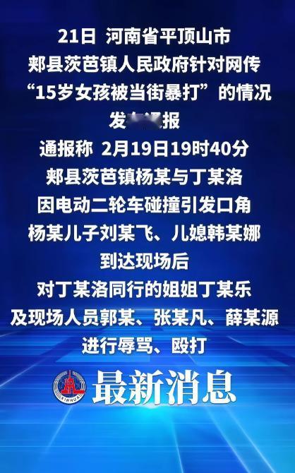 “太恶劣了!”一15岁女孩骑电动车不小心碰倒一老太,便上前道歉,谁知老太并不领情,还出言辱骂,女孩无奈回嘴几句,老太怒不可遏,打电话叫来儿子儿媳。夫妻二人不由分说,就用拖鞋猛扇女孩的脸,用砖头砸女孩的头,又用脚猛踹女孩,甚至还对劝说的路人进行辱骂、殴打,致女孩眉骨骨裂、视力听力严重受损,一直处于半昏迷状态中,具体伤情还有待进一步鉴定,等待这对打人夫妻的将是法律的严惩!律师:若伤情严重,最高或判刑10年。 最近河南平顶山发生的这起恶性伤人事件,直接在全网炸开了锅,无数网友看完现场画面后都气得血压飙升,大家纷纷表示从来没见过如此嚣张跋扈、无视法度的施暴行为。 这起发生在新春佳节里的暴力案件,起因小到不能再小,最后却酿成了让一个花季少女身受重伤的悲剧,整件事的发展过程,让人越看越觉得揪心又愤怒。 2026年2月19号,河南平顶山的街上满是过年的热闹气息,当时 15 岁的女孩小丁骑着电动二轮车,车上还带着 12 岁的弟弟,两个孩子刚走亲访友结束,正安安稳稳地往家里赶。 在途经一处路口时,女孩的电动车和一位杨姓老太的车辆发生了极其轻微的剐蹭,碰撞力度小到只是车身擦过,老太根本没有摔倒在地,身体也没有出现任何不适。 女孩第一时间就停下车子,快步走到老太身边,满脸愧疚地接连道歉,态度十分诚恳。 可让人没想到的是,老太不仅不接受这份歉意,反而立刻拔高音量,对着女孩说出各种难听的辱骂话语,言语间全是恶意攻击,丝毫没有长辈该有的包容。 女孩才刚上初中,长这么大从没被人这样当众羞辱,她实在忍不住,就小声回了几句辩解的话。 就是这几句普通的反驳,彻底激怒了这位老太,她当场掏出手机,给自己的儿子和儿媳打电话,添油加醋地说自己被孩子欺负,让家人赶紧过来 “撑腰出气”。 挂掉电话后,老太依旧拦在电动车前,不停辱骂女孩,把年幼的弟弟吓得躲在一旁,浑身发抖地给家人打电话求助。 短短十几分钟后,老太的儿子和儿媳就开车赶到了现场,这对夫妻完全没有询问事情的前因后果,甚至没看一眼车辆的剐蹭情况,一眼就盯上了瘦弱的女孩,当场就展开了疯狂的暴力攻击。 从围观群众流出的视频能够看出,这两人下手狠辣,丝毫没有顾及小丁是个未成年女孩,尤其是老太的儿子,用砖头和拖鞋轮番对小丁的头进行施暴。 周围有几位路人实在看不下去,纷纷上前劝说,没想到这对夫妻连好心路人都不放过,三位上前劝阻的群众都遭到辱骂和推搡,现场的混乱程度让人不忍直视。 直到民警和救护车火速赶到现场,这对丧失理智的夫妻才停下暴行,警方当场就将两人控制住,受伤严重的女孩则被紧急送往郏县中医院抢救。 女孩的母亲赶到医院后,看着病床上的女儿直接崩溃大哭,她在接受采访时说,孩子被送到医院时就处于半昏迷状态。 经过初步诊断,女孩眉骨出现骨裂,视力和听力都受到了严重损伤,一只眼睛看东西模糊不清,耳朵里一直有耳鸣的情况,连家人的说话声都听不真切。 2 月 21 日,相关部门发布了官方通报,明确通报内容显示,这起事件由电动车剐蹭引发口角,老太的家属抵达现场后,对女孩以及三位路人实施辱骂、殴打,目前两人因涉嫌寻衅滋事罪,已经被警方依法刑事拘留,案件正在进一步侦办中。 从公开的司法数据来看,我国每年都会发生超过 5000 起因日常小纠纷升级为暴力冲突的案件,其中针对未成年人的暴力侵害行为,都会被司法机关依法从重处理。 这对夫妻的暴行,完全符合寻衅滋事罪里 “随意殴打他人、情节恶劣” 的定罪条件,而且受害者是未满 18 周岁的未成年人,还在公共场所施暴、殴打无辜路人,属于法定的加重处罚情形。 专业律师结合同类案件给出解读,这类因小摩擦引发的恶性暴力事件,量刑会严格按照伤情鉴定结果判定。如果女孩的伤情被鉴定为轻伤,施暴者会面临三年以下有期徒刑。 一旦鉴定结果为重伤,量刑档次会直接提升,施暴者将面临三年以上十年以下有期徒刑,也就是说,这对夫妻最高可能会被判处十年有期徒刑。 截至目前,受伤的女孩还躺在医院的病床上,依旧没有完全清醒,家人寸步不离地守在床边,既心疼孩子的遭遇,又在等待伤情鉴定的最终结果。 生活里难免会遇到小摩擦、小剐蹭,冷静沟通、依法处理才是正确的解决方式,街头巷尾从来不是肆意施暴的地方,公共秩序更不允许被随意践踏。 不管是为了家人还是自己,都要守住法律的底线,一旦越过红线,做出伤害他人、破坏秩序的暴行,等待的必然是法律最严厉的制裁,再后悔也来不及弥补造成的伤害。 对于这件事,您有什么想说的吗?欢迎评论区留言讨论。 信源:新华社2026-02-21——《河南平顶山针对网传“15岁女孩被当街暴打”发布情况通报》