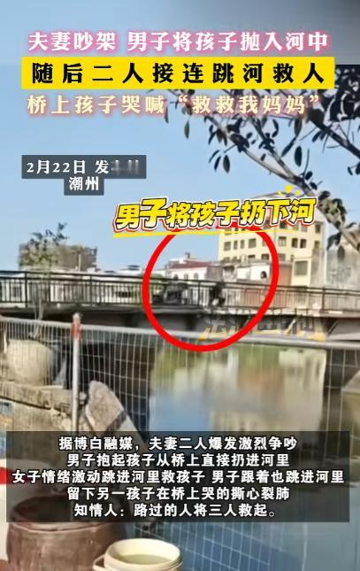 离了大谱!2月22日,潮州,夫妻二人爆发激烈争吵,男子抱起孩子从桥上直接扔进河里,女子情绪激动跳进河里救孩子,男子跟着也跳进河里,留下另一孩子在桥上哭的撕心裂肺。 夫妻之间吵架本是一件生活中正常的事情,但吵架归吵架,千不该万不该把怒火牵扯到孩子的身上。 2月22号,广东潮州的桥上,一对夫妻带着两个孩子骑着电动车停在桥边,本来一家人其乐融融的,可不知道哪句话戳中了矛盾,夫妻俩的语气突然变了,先是小声拌嘴,跟着声音越来越大,情绪越涨越高,争吵声越来越尖,在安静的桥面上格外扎耳。 两个孩子被父母突然爆发的火气吓得不敢出声,路过的人听到争执声纷纷停下脚步,有人想上前劝两句,脚还没迈出去,更疯狂的一幕毫无征兆地砸在了所有人眼前。 男子在争吵里彻底失了控,脸色绷得铁青,他猛地松开车把,用尽全身力气抱起怀里的幼子,不顾周围路人的惊呼,也不管桥下一米二深的河水,转身就把孩子朝着桥下狠狠扔了出去。 “扑通” 一声沉闷的落水响,像块重石砸在每个人心上,现场瞬间静得可怕,所有人都被这极端举动惊得僵在原地,脑子一片空白。 孩子落进水里,小小的身子很快被河水漫过,只有微弱的扑腾声从水面传出来,看得人心脏揪成一团。 孩子母亲看见孩子被扔下河,整个人瞬间崩断了弦,一声撕心裂肺的哭喊冲出口,她半秒都没犹豫,连外套鞋子都来不及脱,直接纵身从桥上跳了下去。 冰冷的河水一下子裹住她,她却像没感觉到冷,拼尽全力朝着孩子的方向游,母性的本能压过一切恐惧,眼里只有水里的小身影。 就在母亲跳进河里后,刚才失控的男子像是突然醒过神,慌乱里也紧跟着跳了下去,一时间桥下水波翻涌,三个人在水里起起伏伏,情况险到了极点。 留在桥上的另一个孩子亲眼看着爸妈和弟弟全掉进河里,小小的年纪根本不懂发生了什么,她死死抓住冰凉的桥栏杆,对着河面放声大哭。 哭声哑得厉害,又尖又碎,撕心裂肺地在桥面上飘着,小女孩一边哭一边朝着河里拼命喊,翻来覆去只有一句 “救救我妈妈”,稚嫩的声音戳得路人鼻子发酸。 短暂的震惊过后,桥上的人全反应过来,没有一个人袖手旁观,全都立刻动了起来。 一位路过的好心人第一个冲到桥边,快速扫了眼水里的情况,一边轻声安抚桥上哭到发抖的小女孩,让她别害怕,一边朝着河里喊,让落水的三人稳住别乱扑腾,保存体力。 其他路人也各司其职,有人掏出手机飞快拨 110 和 120,清晰报出新潮大桥的位置和紧急情况。 有人跑回附近店铺,扛来长木头、竹竿,直接往水里扔,给落水的人借力,素不相识的陌生人因为这场意外凑在一起,心里只有一个念头 —— 赶紧把人救上来。 最先冲上去的好心人不顾河水冰凉,顺着桥边台阶慢慢下水,一点点靠近水里的三人。 河水里,母亲已经拼尽全力把孩子抱在怀里,却累得快撑不住,身子在水里晃来晃去,男子也在水里慌得乱抓,根本稳不住。 好心人游到他们身边,先稳稳托住孩子,确保小脑袋露出水面不呛水,再扶着母亲的腰帮她省力气,随后又拉住男子,带着三人慢慢往岸边挪。 岸边的路人伸手组成人链,弯腰朝着水里够,一点点接应,合力把人往岸上拉,被救上来时,三个人浑身湿透,冻得嘴唇发白,年幼的孩子受了巨大惊吓,脸色惨白,哭得上气不接下气。 母亲紧紧抱着孩子不肯松手,情绪还在崩溃边缘,一边哭一边摸孩子的身子,怕有一点闪失。 没多久,民警和 120 急救车就赶到了,医护人员立刻上前检查三人的身体,好在河水不深,救援又及时,三个人都没有生命危险,只是受凉和受了惊吓,没有严重伤情。 民警现场安抚当事人情绪,向目击者了解事情经过,对这起事件展开详细调查。 日常相处里,夫妻之间难免有磕磕绊绊、争执矛盾,这是生活里再普通不过的事情,可再激烈的情绪,再难解的分歧,都不该拿无辜的孩子、至亲的生命当作发泄的筹码。 而陌生人递出的援手,总能在最险的时候,托住一个个快要下坠的家庭。 对于这件事,您有什么想说的吗?欢迎评论区留言讨论。 信源:法治进行时2026-02-23——《夫妻吵架 男子将孩子抛入河中 随后二人接连跳河救人,桥上孩子哭喊"救救我妈妈”》