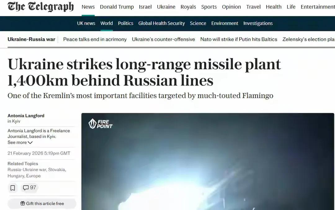 乌克兰“火烈鸟”导弹取得重大战果,炸掉了俄罗斯洲际导弹生产厂! 相信关注俄乌局势的朋友,最近都被一条消息刷屏了——2月21日深夜,乌克兰动用自己研发的“火烈鸟”巡航导弹,千里奔袭1400多公里,精准击中了俄罗斯腹地的沃特金斯克机械制造厂,这座俄罗斯最核心的洲际导弹生产基地,瞬间被大火吞噬,生产工作被迫全面停止,还造成了11人受伤。 除此之外,乌军还同步袭击了俄萨马拉州一处为俄军提供能源保障的天然气加工厂,可谓是打出了一场漂亮的远程突袭战。 可能很多观众会好奇,这款“火烈鸟”导弹到底是什么来头?毕竟在此之前,大家听得多的要么是西方援助乌克兰的导弹,要么是俄罗斯的各类重型武器,乌克兰自主研发的导弹,能有这么大的威力吗? 根据央视新闻等权威媒体报道,“火烈鸟”是乌克兰“燃点”公司自主研发的陆基远程巡航导弹,2025年才正式服役,算是乌克兰目前最拿得出手的国产远程打击武器。它不算什么高精尖的“黑科技”,更像是战时“务实派”的产物——弹体用普通玻璃纤维打造,发动机还是挪用的教练机成熟型号,制导方式也只是惯性导航加GPS卫星导航的组合,但胜在性价比高、威力足。 说出来大家可能不信,这款能炸掉洲际导弹工厂的导弹,单枚成本只有50万到100万美元,比西方同类导弹便宜太多,而且它的弹头重量达到了1.15吨,差不多是美国“战斧”导弹弹头的2倍多,摧毁力相当惊人。 更关键的是,它的最大射程能达到3000公里,足以覆盖俄罗斯的整个欧洲部分,不管是莫斯科这样的核心城市,还是各类军工、能源设施,都在它的打击范围之内。 而这次被击中的沃特金斯克机械制造厂,可不是普通的军工厂,它堪称俄罗斯的“洲际导弹摇篮”。 从苏联时代起,这里就是导弹生产重镇,如今更是俄罗斯陆基和海基战略核力量的核心生产基地,我们常听说的“白杨-M”洲际导弹、“布拉瓦”潜射洲际导弹,还有俄军常用的“伊斯坎德尔”系列导弹,全都是从这里生产出来的。 尤其是俄乌冲突爆发后,这座工厂更是加班加点扩大产能,据2026年初俄媒报道,它的“伊斯坎德尔”导弹年产量已经从战前的20到50枚,暴涨到750枚,实现了15倍的增长,工厂24小时三班倒运转,就是为了满足前线的消耗。 可以说,这座工厂就是俄罗斯战略武器的“心脏”,这次被“火烈鸟”击中,对俄罗斯的导弹生产能力,无疑是一次沉重的打击。 还有一个让人疑惑的点,俄罗斯的防空系统一直号称世界顶尖,尤其是S-400防空系统,更是被吹得神乎其神,为什么会让“火烈鸟”这种亚音速导弹,千里奔袭后成功突防呢?其实这并不是“火烈鸟”有多厉害,而是俄军的防空体系出现了严重漏洞。 熟悉局势的朋友都知道,俄军一直是“重前线、轻后方”,为了应对前线的空中威胁,他们把S-400、“道尔”等先进防空系统,全都优先部署在了俄乌边境,而位于中部腹地的沃特金斯克工厂,防空部署形同虚设,不仅远程预警雷达覆盖不足,近程补盲系统也寥寥无几。 更关键的是,“火烈鸟”采用50到100米的超低空巡航方式,正好卡在了S-400雷达的“视力死角”,等雷达发现目标时,导弹已经逼近工厂,根本没有足够的反应时间。 当然,俄军也不是毫无反击,他们随后通报称,已经摧毁了多套“火烈鸟”导弹发射装置,还拦截了5枚该型导弹和百余架无人机,但这并不能掩盖本土核心设施被击中的事实。 而乌军之所以能打出这个战果,也不仅仅是导弹的功劳,他们还用了“无人机诱敌”的战术,先用大批廉价FPV无人机充当诱饵,消耗俄军防空火力,再让“火烈鸟”贴地飞行,借助地形掩护实现突防。 其实这次“火烈鸟”的重大战果,也标志着俄乌冲突的形态发生了变化,双方已经从之前的前线阵地拉锯,转向了对后方战略目标的远程互殴。 乌军靠着“火烈鸟”和无人机,持续削弱俄军的武器生产和后勤能力,而俄军则反击乌军的发射装置和基础设施。 说到底,这场冲突没有赢家,不管是“火烈鸟”的精准打击,还是俄军的反击,最终受苦的都是普通民众。 但从军事层面来看,这次事件也暴露了俄军本土防御的短板,如果不能尽快弥补低空探测、防空资源分配的漏洞,后续可能还会面临更多类似的袭击。 而乌克兰的“火烈鸟”导弹,也用实际战果证明,即便没有过多西方援助,他们也能依靠自身的军工力量,对俄罗斯形成一定的威慑。