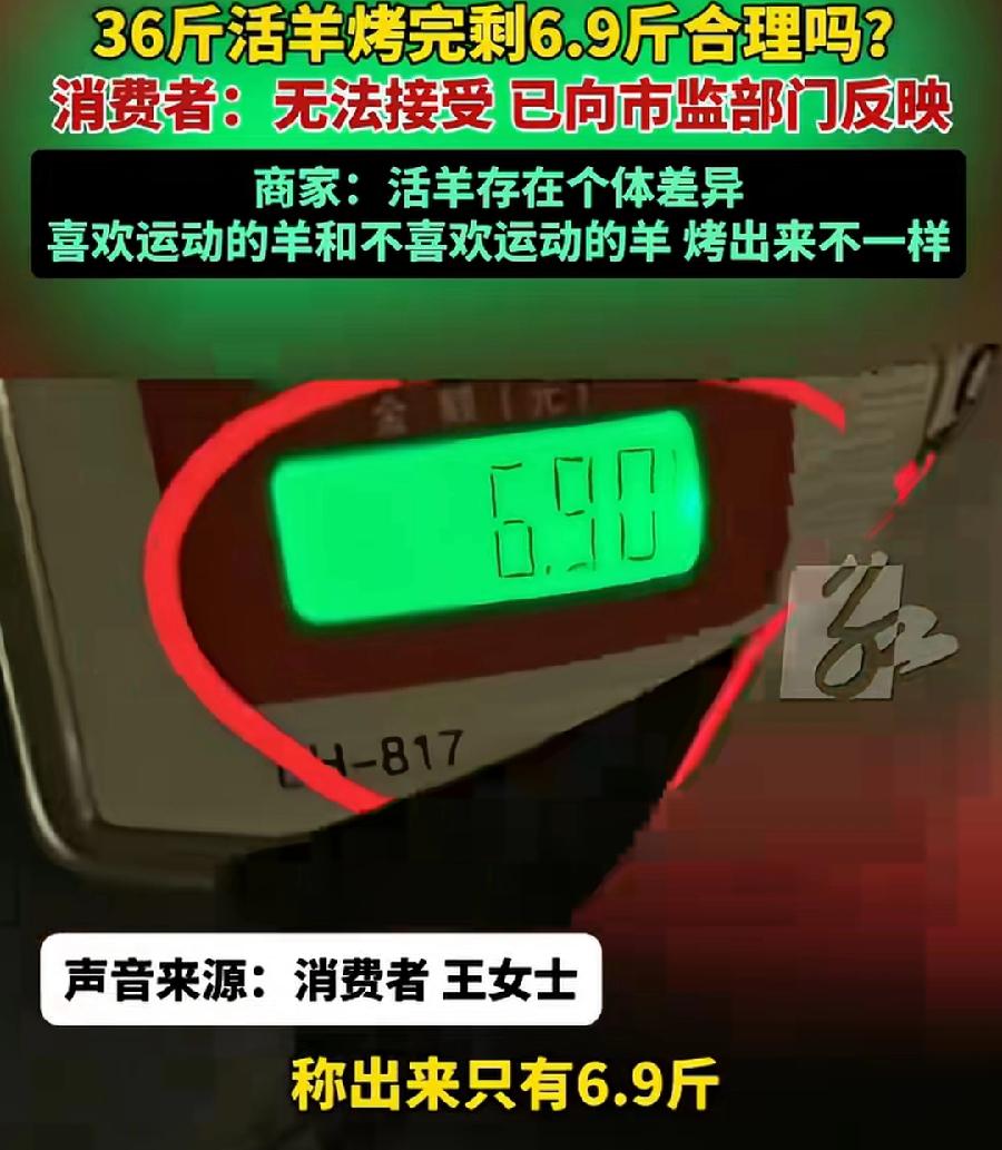 重庆1188元套餐36斤活羊烤完剩6.9斤。女顾客质疑商家偷工减料、缺斤少两。正常情况应该剩12斤左右。少了近5斤太不正常。看店老板是一位年轻帅哥,日常也发了很多宣传视频,主打内蒙古雪山羊活羊现杀,不像是欺骗消费者的人。网友都说了,最好办法,再找一只同样36斤活羊,在市监局监督下,现杀现烤,如果误差超过10%,商家肯定有问题!看后续。