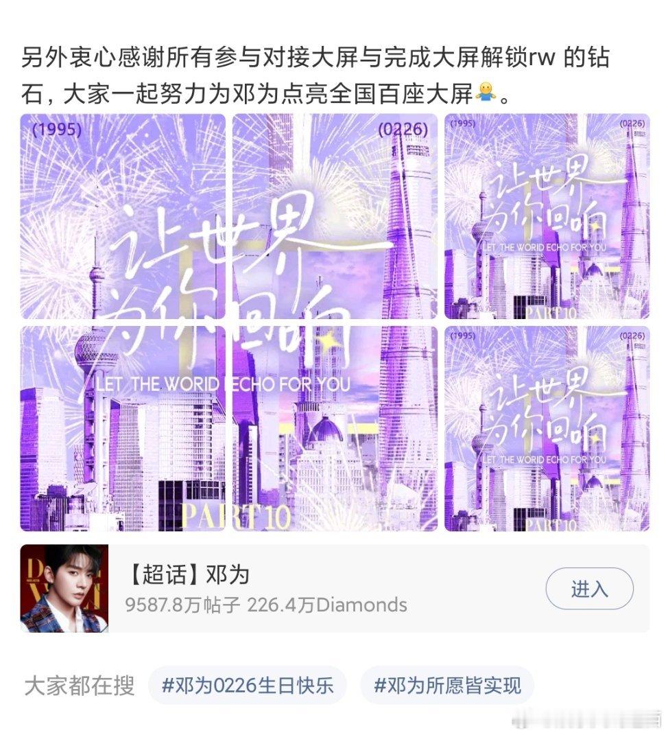 邓为生日应援好震撼!102城市的602座大屏,是钻石对邓为的生日祝福,好炙热的爱意,参与的💎姐们真的很棒很棒