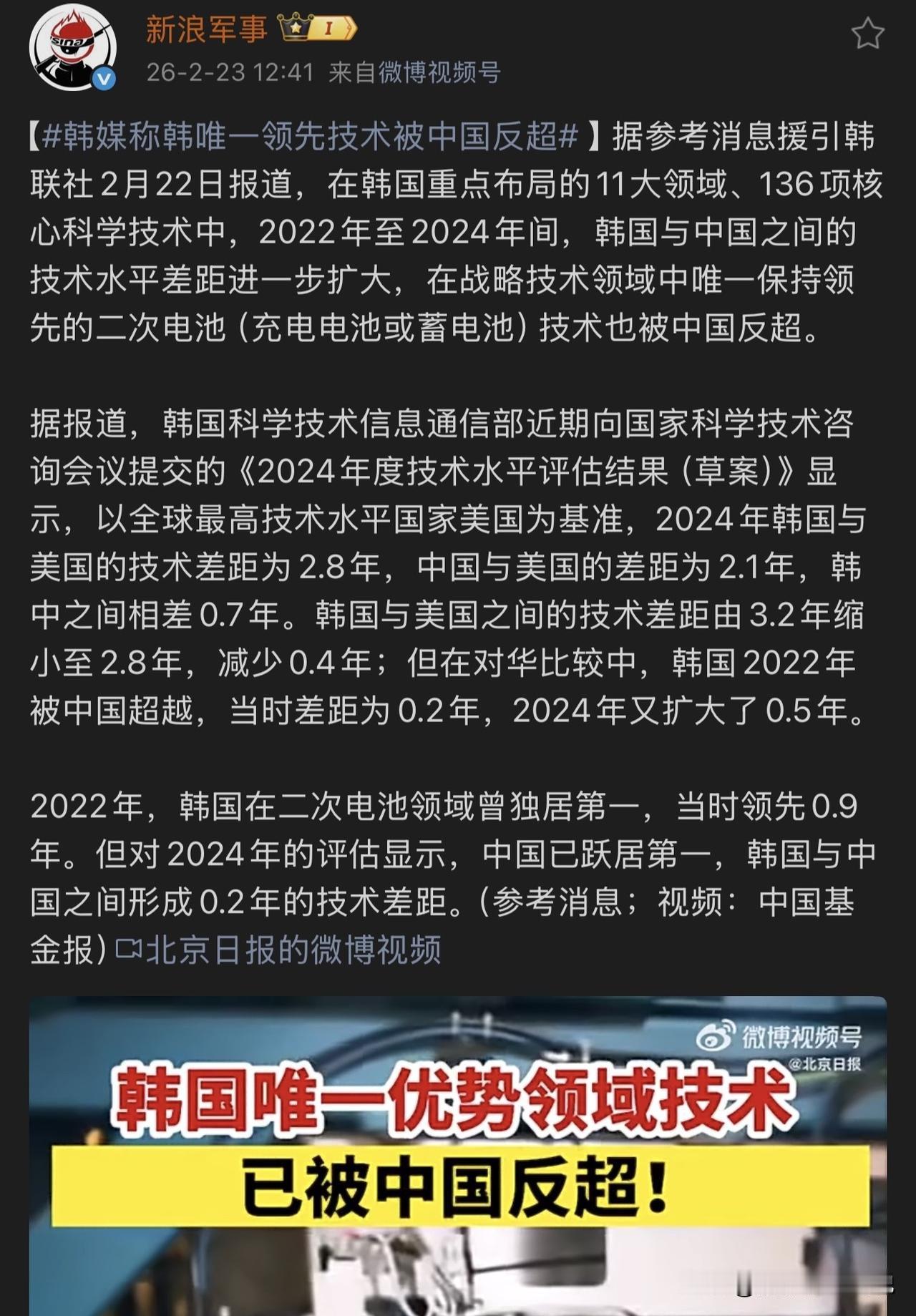韩国现在没有一项优势技术领先中国了,被中国强势反超。今天看到这则消息时还觉得不可思议的,韩国再怎么说也是发达国家,而我国毕竟只是发展中国家,优势领域再少也不至于一项都没有了!但看完韩联社的报道我基本上是信了的,最后一项被反超的优势领域就是二次电池(充电电池或蓄电池)技术。想想也是,这两年我国在新能源领域高歌猛进,每隔一段时间就会看到有新的技术突破,超过韩国也是情理之中的。按照现在我国的底蕴和创新力,一旦超越对手就不会被反超了。所以,在今后的时间内,咱们就是要警惕、警惕再警惕,警惕某些势力铤而走险。