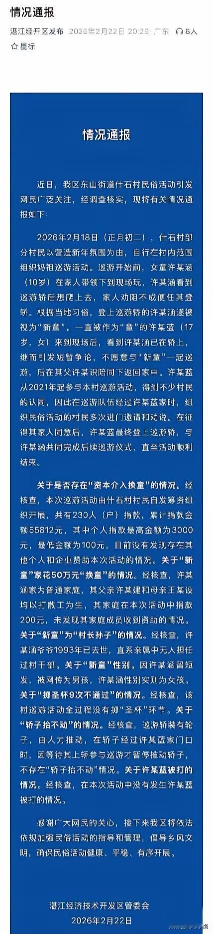 广东湛江妈祖扮演者更换一事,官方消息已公布。 新的扮演者是一位10岁女孩,并非男孩。她是自行爬上轿子的,并非受大人指使,也没有资本介入,其家庭就是普通家庭,在此次活动中仅捐款200元。 事件核心经过如下:2026年农历大年初二,湛江东海岛拾石村举办传统妈祖巡游活动。活动开始前,主办方未依照传统“掷圣杯”仪式选定扮演者的惯例,擅自替换了原定扮演“小妈祖”的女孩,安排另一名孩子顶上。如今官方辟谣表示,顶上的也是女孩,并非男孩。