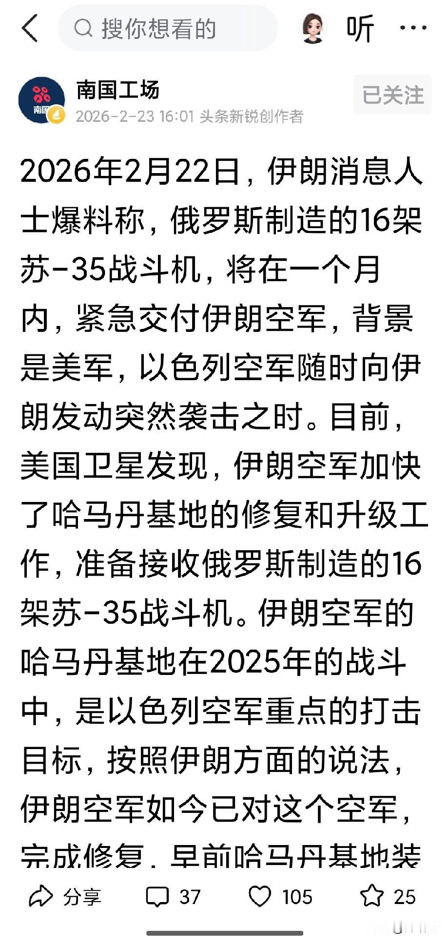 如果南国工厂消息可靠的话,伊朗将在近期接收16架苏35战斗机,这批战斗机将用来替代老旧的f14重型战斗机,这批战斗机应该是原本卖给阿尔及利亚军队的,如今卖给伊朗,俄罗斯将获得一笔巨大的外汇收入,不过伊朗缺乏俄制空优作战系统,而且那批f14战斗机飞行员将要从美制体系转换俄制重型体系,这是需要时间去适应的,这16架苏35将对以色列的f16与美军f18机队构成威胁,也将是美以隐形战斗机重点关照的目标。