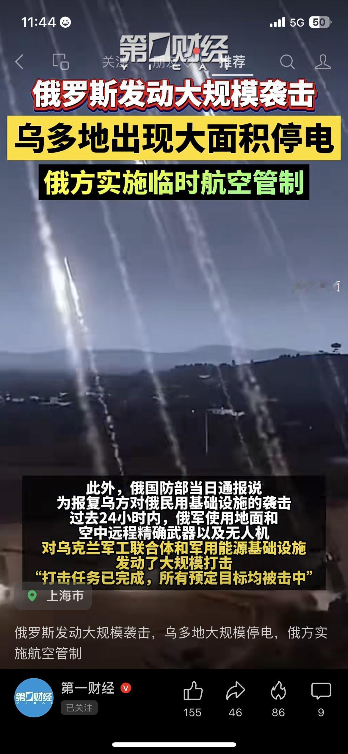 当地时间22日,俄罗斯对乌克兰发动了大规模袭击,用导弹和无人机打击了乌军工联合体和能源基础设施,导致多地出现大面积停电。 乌克兰方面通报,击落了大量无人机;俄方则表示,所有预定目标均被击中,作为对乌方袭击俄民用设施的报复。 同时,俄方还实施了临时航空管制,局势进一步升级。 我刷到现场视频的时候,真的很揪心:平民的家园被炸毁,电力中断,孩子们在黑暗中哭泣。 战争从来没有赢家,受苦的永远是普通人。 希望和平能早日到来。 俄乌冲突 乌克兰 俄罗斯 战争 和平 俄乌冲突