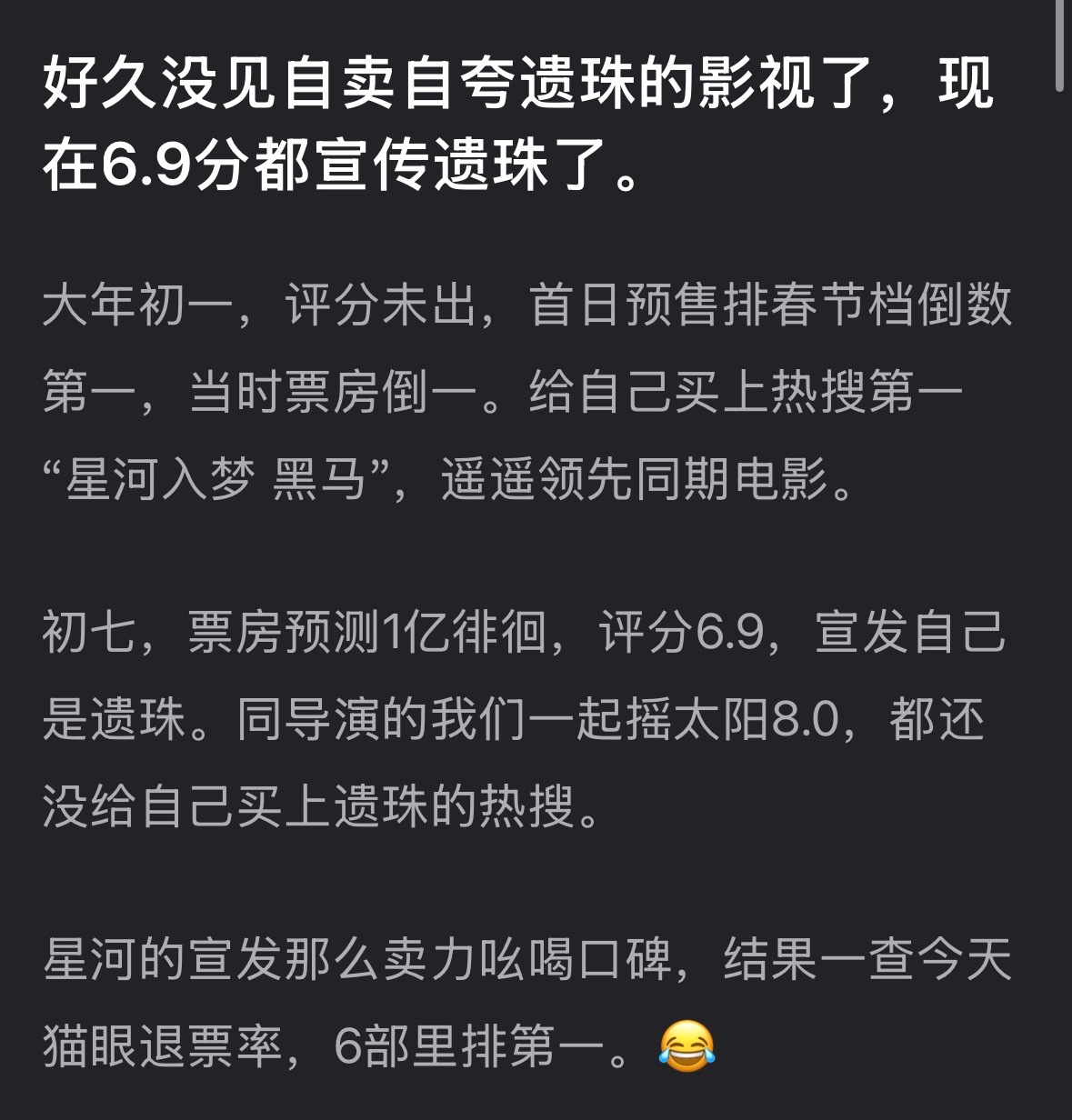 网友吐槽电影星河入梦好久没见自卖自夸遗珠的电影了,现在6.9分都宣传遗珠了