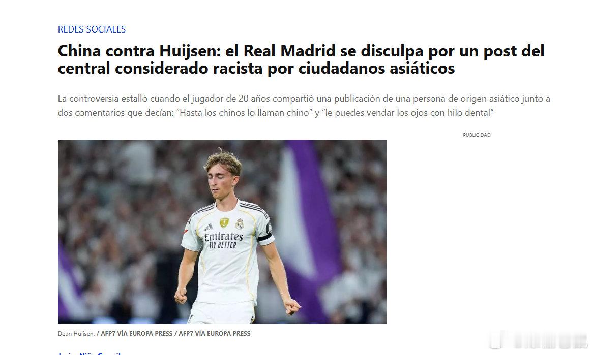 【“敷衍式道歉”】多家西班牙媒体报道了赫伊森“在社交媒体上转发涉嫌辱华”的事件,称皇马官微发布赫伊森的道歉信息,引起了中国球迷的批评,不少球迷质疑道歉的平台和范围,要求赫伊森在国际平台上发表公开声明或制作视频,而不是仅仅发布一条道歉信息。西甲