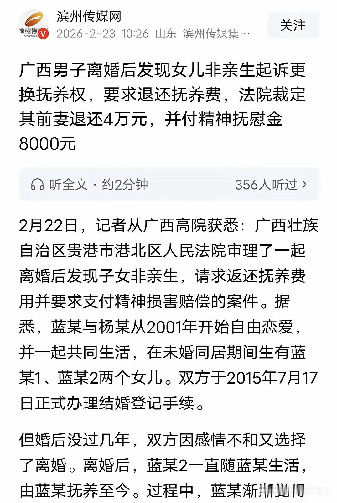 广西,男子离婚后小女儿归他抚养,大女儿归前妻,渐渐他发现小女儿不像自己,怀疑不是亲生,便去做了亲子鉴定,结果让他五雷轰顶,小女儿果真不是他亲生的,男子一怒之下告上法院,要变更抚养权,并要求前妻返还抚养费,赔偿精神损失费,法院判决让人意外。 谁也没想到,一场亲子鉴定,彻底打乱了广西一名男子的生活。这名男子在与前妻离婚后,按照协议独自抚养小女儿,大女儿则由前妻照顾。 原本平静的单亲抚养生活,在孩子慢慢长大的过程中,悄悄出现了让他不安的变化。他发现小女儿的长相、神态和自己几乎没有相似之处, 身边亲友偶尔的无意提及,也让他心里的疑虑越来越重,原本深埋的不安逐渐变成无法忽视的疑问,最终促使他下定决心去寻求一个确切答案。 为了解开心中的困惑,男子独自带着小女儿前往专业鉴定机构做亲子鉴定。等待结果的每一刻都充满煎熬,他既希望是自己多想,又害怕面对最不愿接受的真相。 当鉴定报告摆在面前,明确显示排除他与小女儿的亲生血缘关系时,这个结果如同晴天霹雳,让他瞬间陷入崩溃。 多年的悉心照顾、日夜陪伴、经济付出,全都建立在错误的认知之上,那种被欺骗的愤怒与委屈,让他难以平静面对眼前的一切。 从得知真相的那一刻起,男子便无法再继续维持原本的抚养状态。他整理好相关证据,将前妻起诉至当地法院,提出三项明确诉求:一是变更小女儿的抚养权,由孩子的亲生母亲也就是前妻承担抚养责任; 二是要求前妻返还这些年来他独自付出的全部抚养费用;三是申请精神损害赔偿,弥补长期被隐瞒带来的精神伤害。 男子原本以为,自己的诉求合情合理,法院会支持他的全部请求,可案件审理后的判决结果,却出乎很多人的意料。 法院在审理过程中,结合亲子鉴定报告、双方离婚协议、抚养支出凭证等完整证据链,认定男子与小女儿无生物学父女关系,对孩子无法定抚养义务,支持变更抚养权,将小女儿交由前妻直接抚养。 针对男子提出的抚养费返还与精神损害赔偿,法院结合当地生活水平、男子实际支出情况、女方过错程度等多重因素综合判定,最终判决前妻返还抚养费4万元,并支付精神损害抚慰金8000元。 这样的判决既维护了无过错方的合法权益,也在法律框架内作出了均衡裁量,和当事人原本预期的全额高额赔偿存在明显差异,也让关注此事的人感受到司法裁判的严谨与尺度。 整件事从男子心生疑虑,到鉴定揭开真相,再到法庭诉讼与判决落定,全程充满了现实的无奈与情感的波折。 男子在不知情的情况下履行了多年抚养义务,物质与精神的双重付出,最终以法律方式厘清责任;而前妻因隐瞒关键事实,承担了相应的法律后果。 整个案件没有激烈的戏剧化冲突,却真实折射出婚姻关系中诚信缺失带来的连锁影响,也让更多人看到法律在处理此类情感与财产交织纠纷时的明确边界。 对此,你们有什么看法,欢迎评论留言~